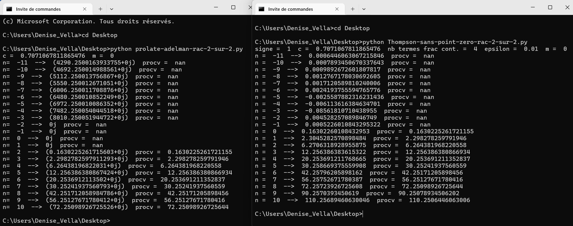 170) On essaie en vain de trouver par un programme de calcul des valeurs propres des fonctions d’ondes sphéroïdales (prolate) fourni par Thompson dans son atlas de calcul des fonctions mathématiques (son programme est en C, on le convertit en python) une suite de nombres qui avoisineraient ceux de la suite [39,94,152,214,278,324,415,487,562,640,719,801,885,971] ; on ne parvient d’ailleurs pas à obtenir les valeurs fournies par Estelle Sonnenblick ou celles fournies par Richard-Jung et al. (ces dernières concordant cependant avec les valeurs de la fonction pro_cv en python)