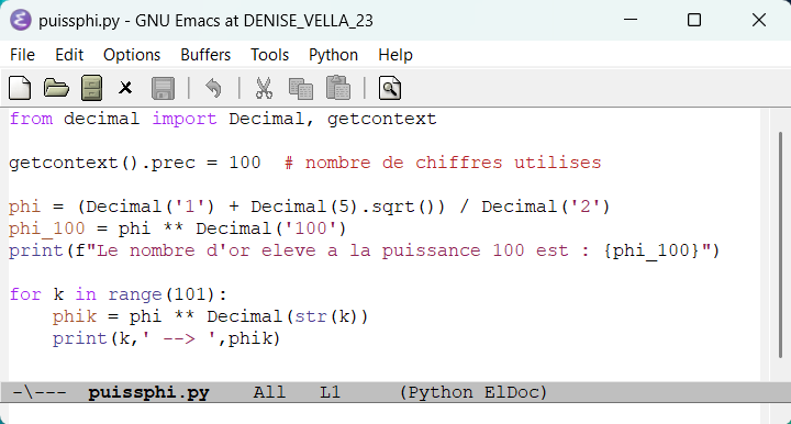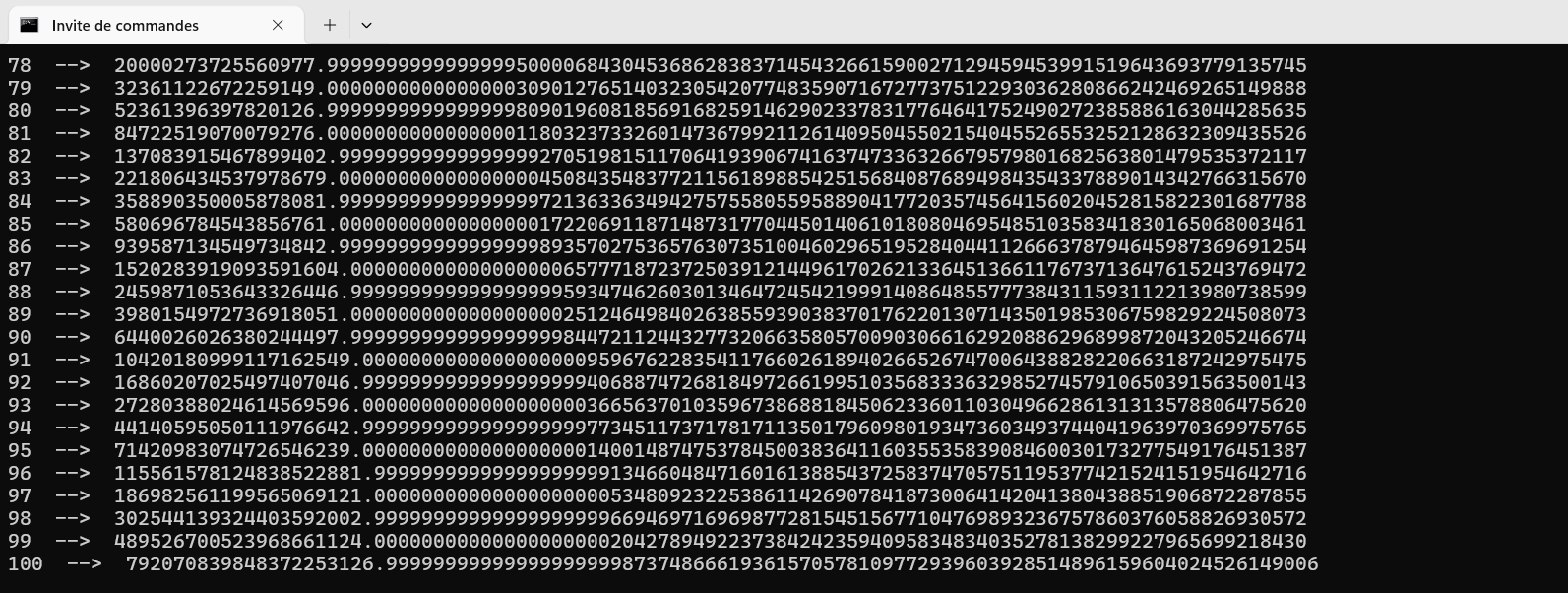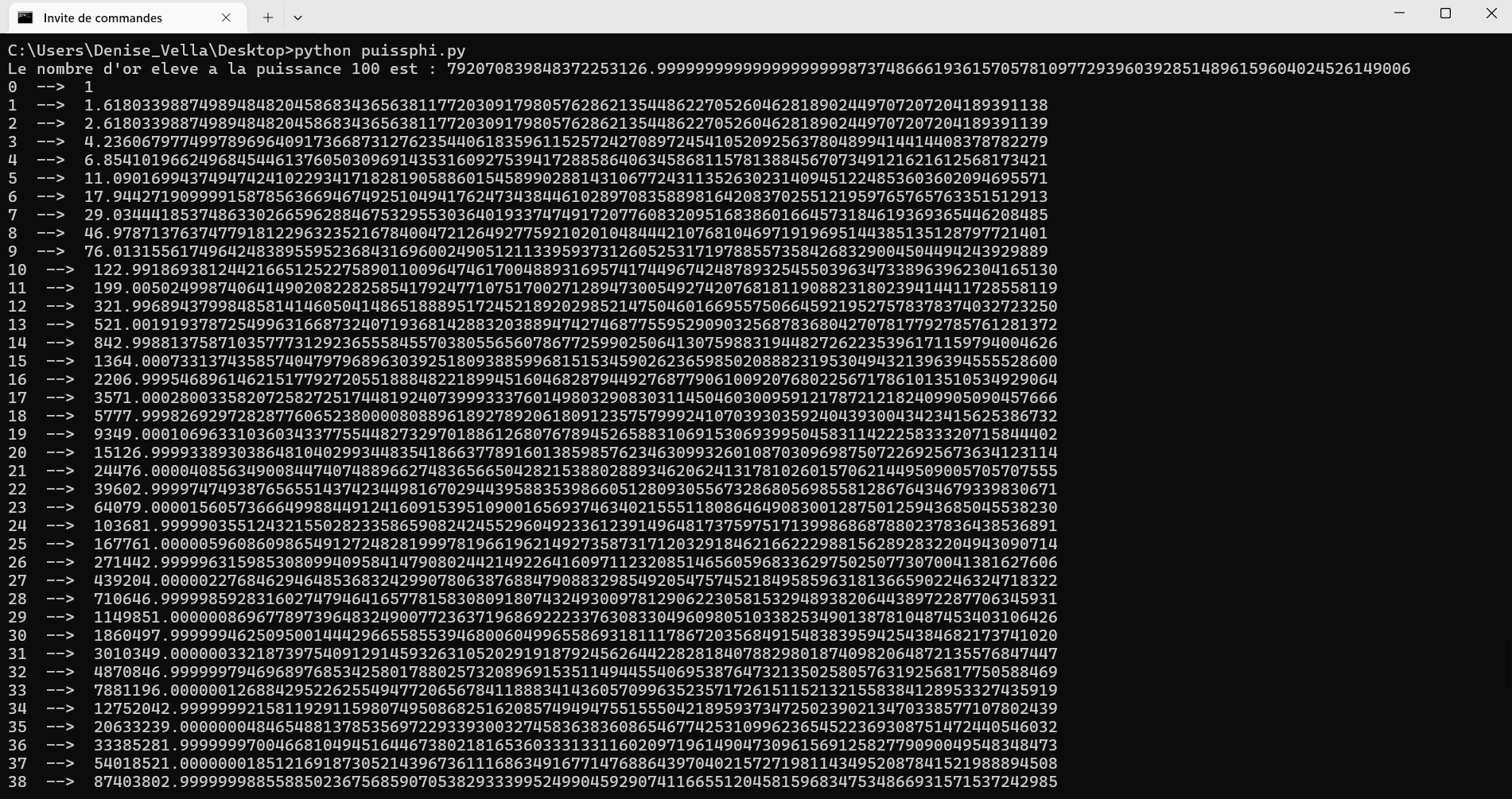 131) Le nombre d’or est irrationnel, il intervient dans les pavages de Penrose, l’espace des pavages de Penrose est un espace non commutatif. Les puissances de φ le nombre d’or sont très proches des nombres entiers (leur écriture décimale comporte soit pas mal de 0, soit pas mal de 9 après la virgule). C’est ce qui est montré dans le programme python ci-dessous et les copies d’écran de son résultat.