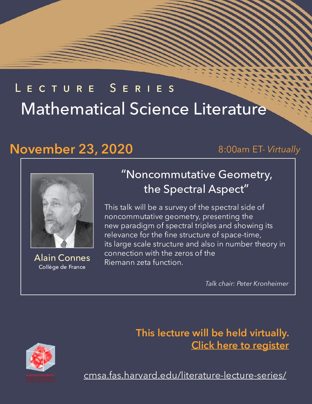 23 novembre 2020 : Noncommutative Geometry, the spectral aspect (dans le cadre des Lecture series Mathematical Science Literature de l’Université d’Harvard)