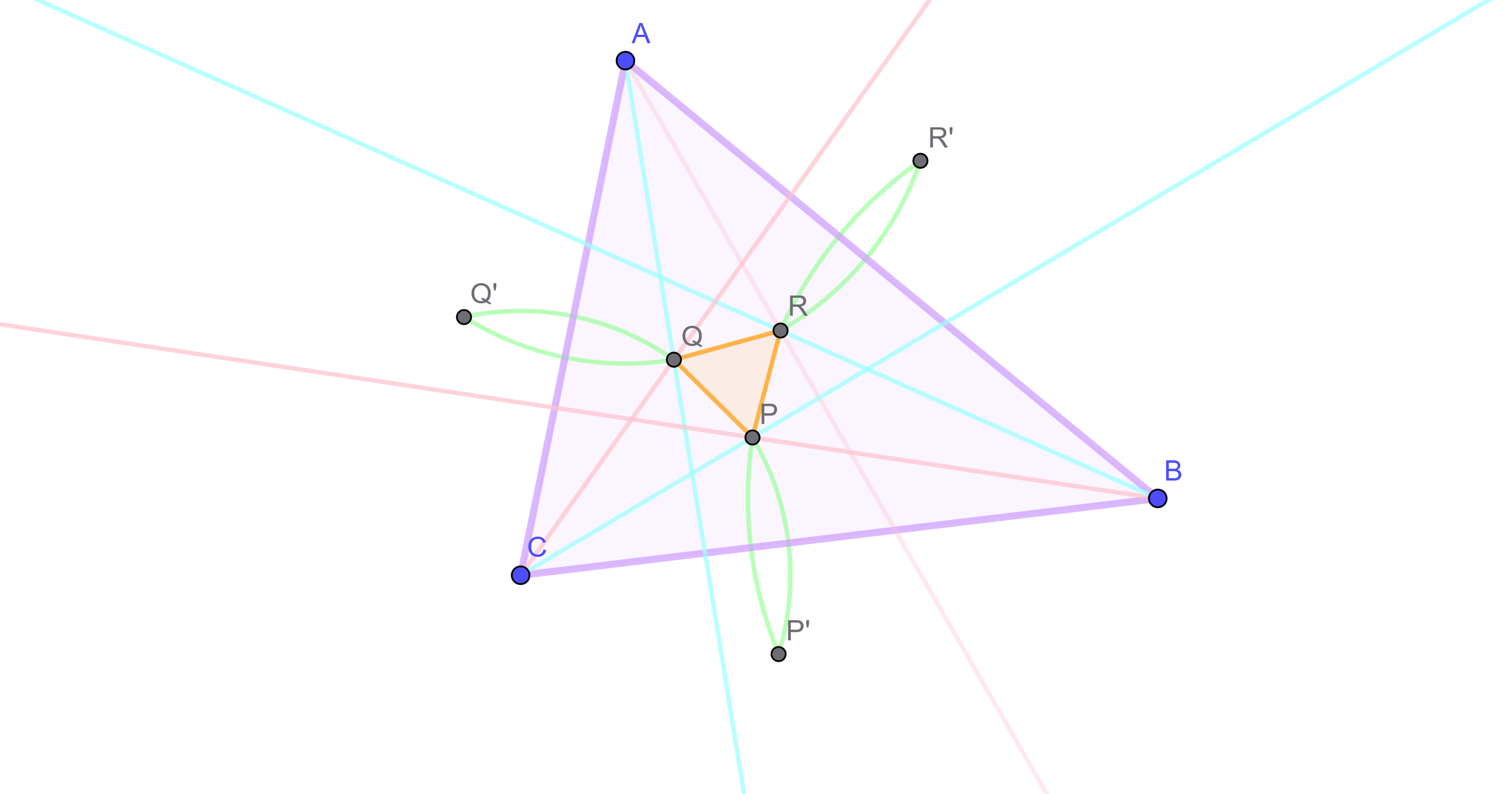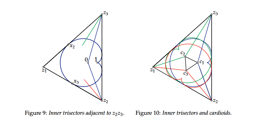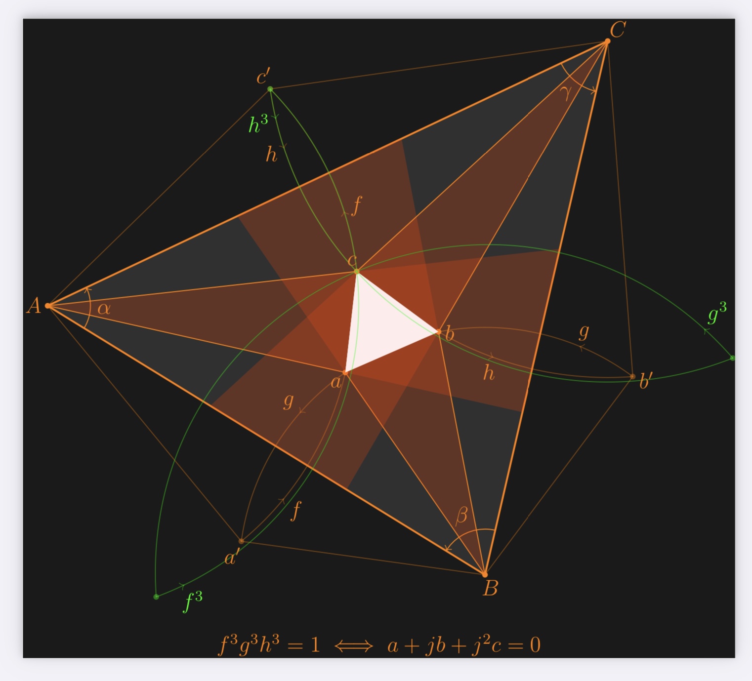 (illustration obtenue en utilisant la plateforme Geogebra, programmée par Jacques Chemla ici ou par moi-même là ) de la preuve d’Alain Connes du théorème de Morley)
