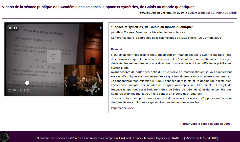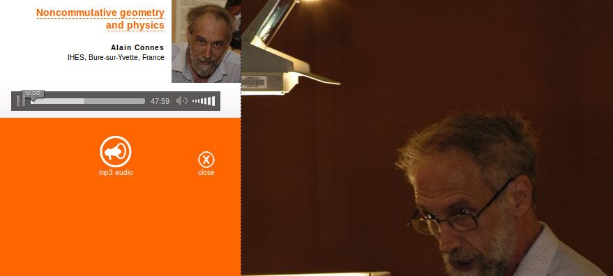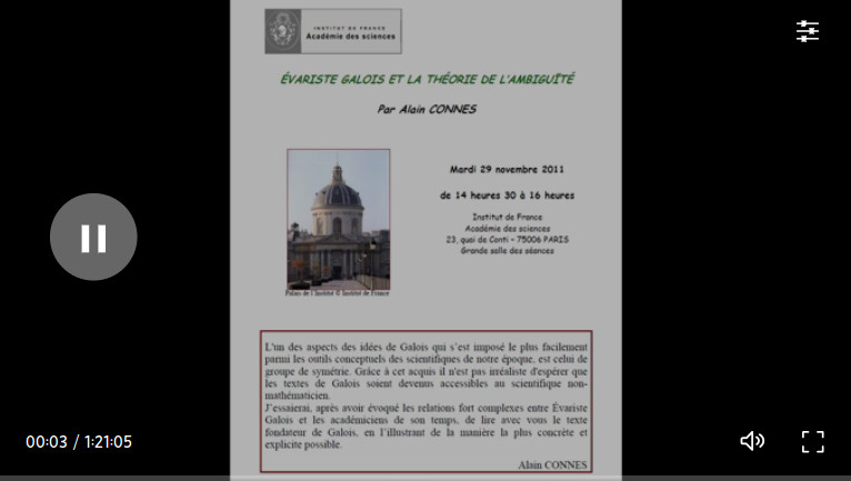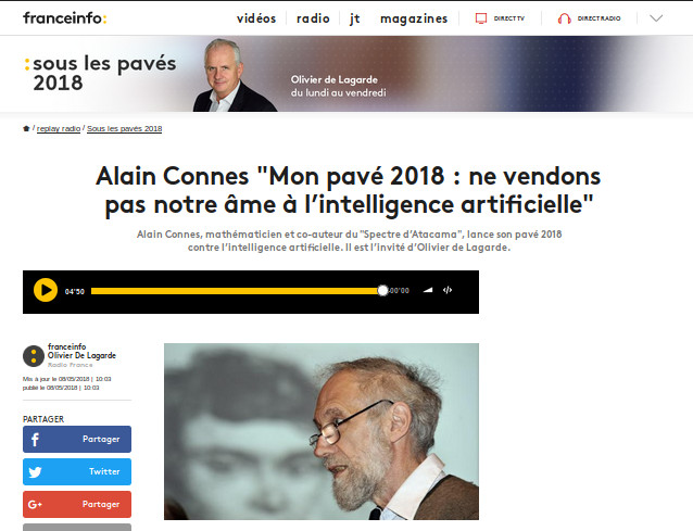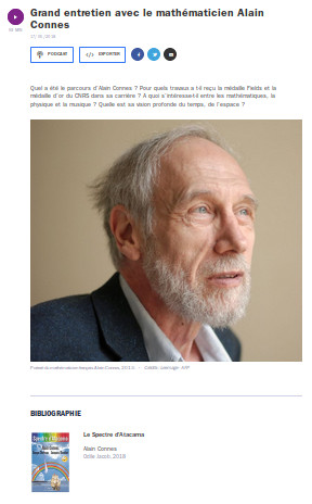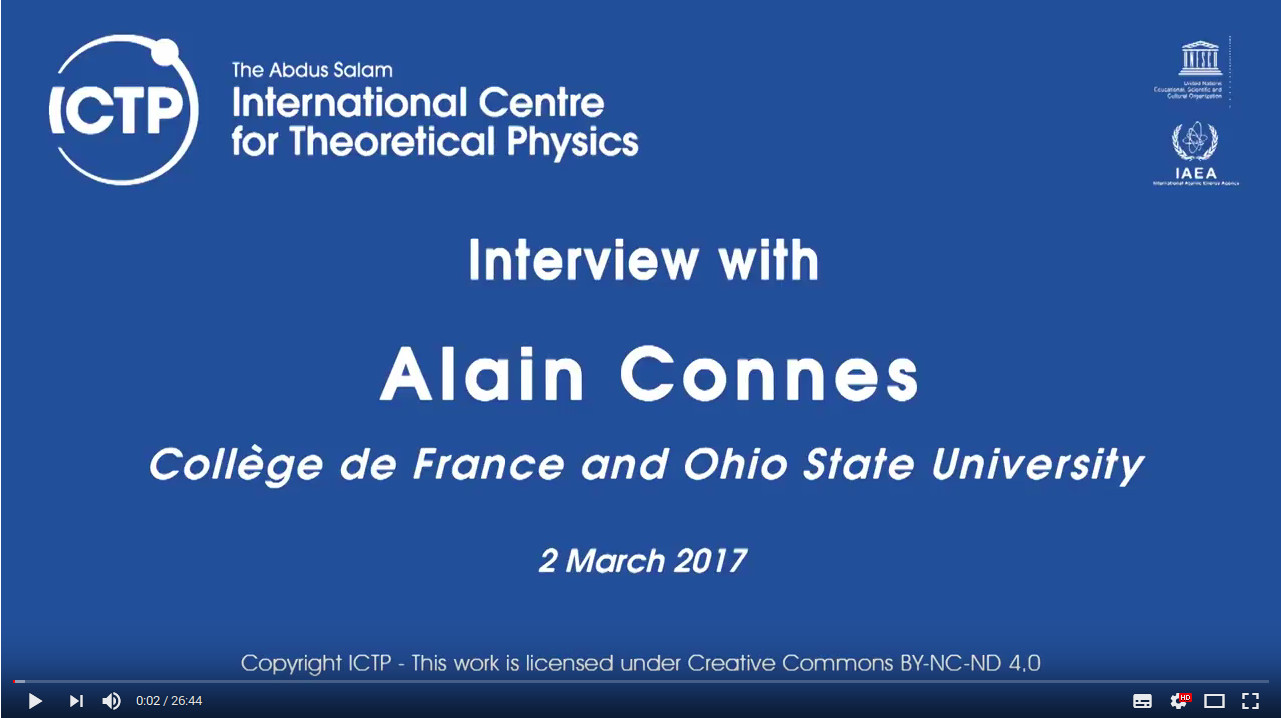 Interview C.Goldstein et G.Skandalis  Interview en Iran  Thinking in motion  Exposition Dépaysement soudain Donc, au départ  H.  Blog  PLS  Geometry and the Quantum  avec Pierre Boulez  Table ronde AG Dualité formes et spectres  sur France Culture dans l’émission de Nicolas Martin  Entretien C. de F.  à l’ICTP  Transcription vidéo Colloque Langage  a topo on topos avec J.C. Yoccoz  Parcours d’un mathématicien dans un Salon du Livre Imagination Transcriptions de vidéos  Transcriptions de textes  Synesthésie de Messiaen  An outer view of an inner world  Adieu à un génie, Vaughan Jones