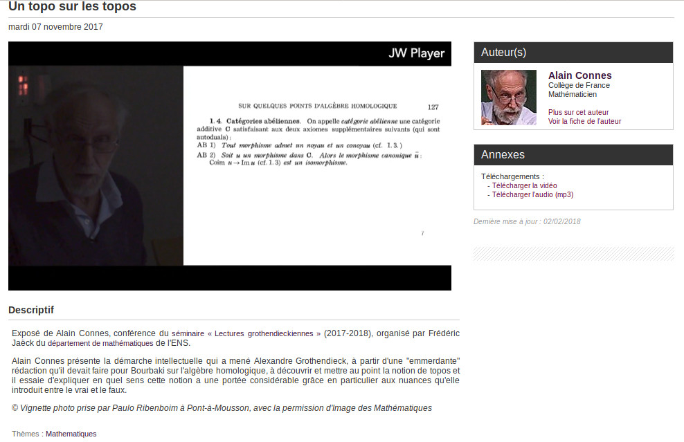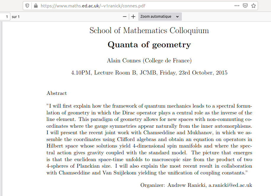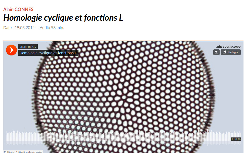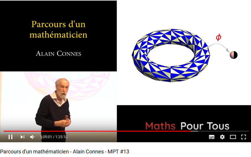 fin juin 2021 : Transcription d’un article aux Comptes-Rendus de l’Académie des Sciences de 1840 : Théorèmes divers sur les résidus et les non-résidus quadratiques d’Augustin Cauchy Trouver la racine par les racines fin juin 2021 : deux dernières traductions : un article L’hamiltonien de mise à l’échelle et un paragraphe de livre Système quantique et fonctions prolates 11.2020 : autres transcriptions de videos d’Alain Connes un extrait Traduction d’Une nouvelle preuve du théorème de Morley interviewé par Alain Prochiantz sur France Culture : L’imagination et l’infini conférence de clôture Les mathématiques et la pensée en mouvement du Cycle Pluridisciplinaire d’Etudes Supérieures, Cursus PSL - Paris Sciences et Lettres) février 2019 de la conférence Un topo sur les topos en 2017 à l’ENS dans le cadre des lectures Grothendieckiennes, et dont un extrait est consultable ici Traduction en français de l’article d’Alain Connes Formule de Trace en géométrie non-commutative et zéros de la fonction zêta de Riemann Traduction en français de l’article d’Alain Connes et Jean-Benoît Bost : Algèbres de Hecke, facteurs de type III et transitions de phase avec brisure spontanée de symétrie en théorie des nombres Traduction en français de l’article d’A.Connes à l’ICM 86 (à Berkeley) : il était déjà question de Topos de Grothendieck dans cet article Traduction de la critique du livre Géométrie non commutative par Ingrid Segal Transcription LaTex de la leçon inaugurale d’Alain Connes au Collège de France Quelques extraits de livres ou magazines : La géométrie de l’incertitude (Dana Mackenzie) La vérité est mathématique (Alain Connes) L’incroyable efficacité des mathématiques (Dominique Lambert) Extraits de Mathématiques, un dépaysement soudain et de Les déchiffreurs Traduction de l’article Conseils au débutant d’Alain Connes Transcription en Latex du tapuscrit de la vidéo de Dars et Papillault Mes rencontres avec Jacques d’Alain Connes  Je dépose ici les compilations de certaines de ces transcriptions et traductions sous la forme de 13 fichiers "en vrac".