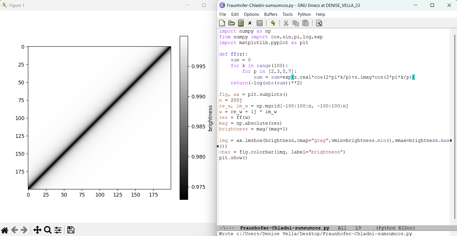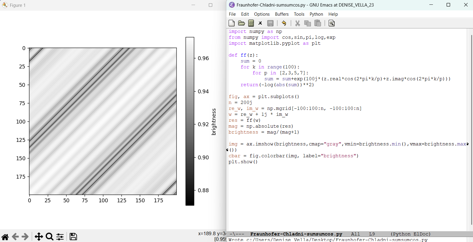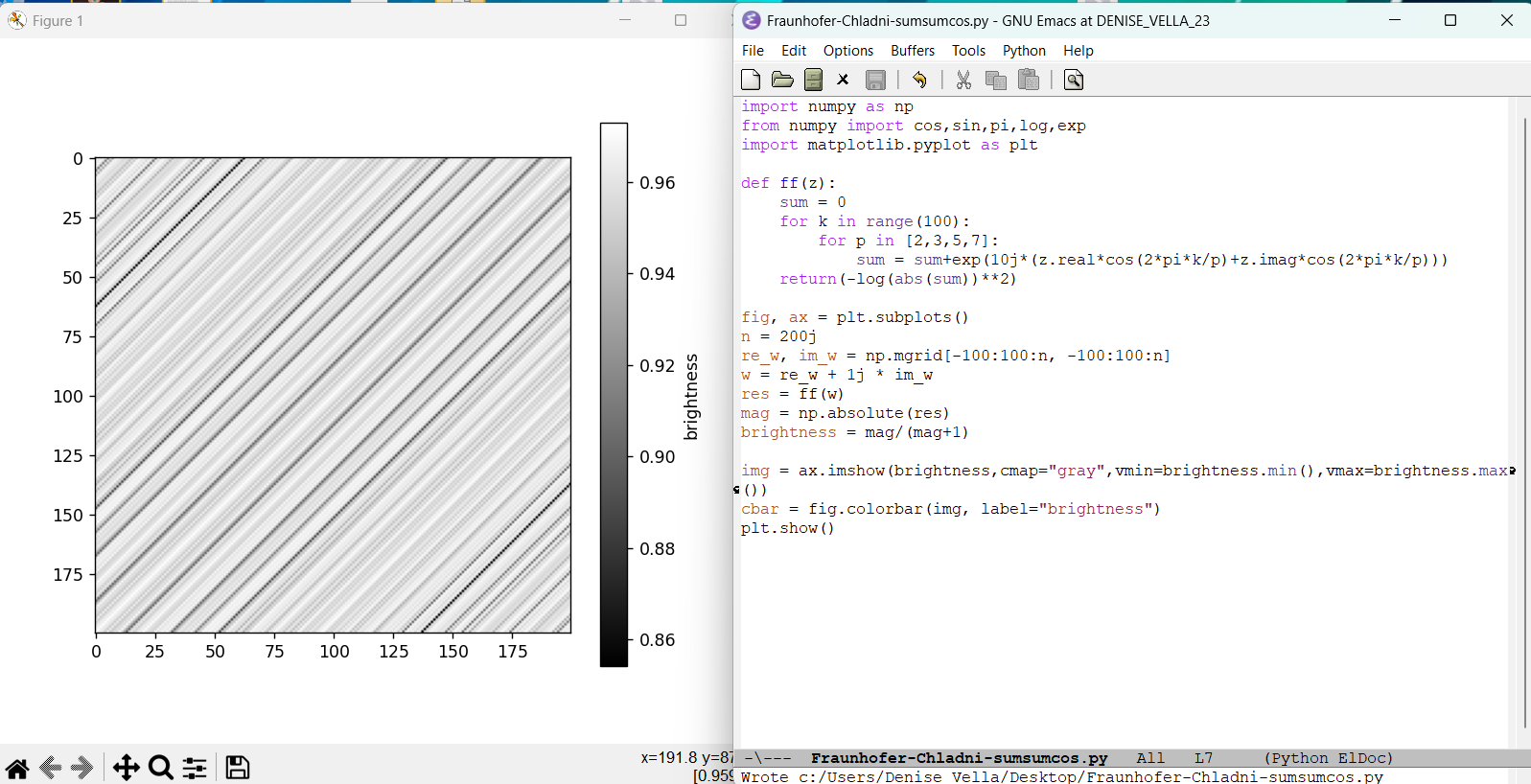 en essayant de calculer les dessins de Chladni de "ma" somme de somme de cosinus qui s’annule seulement pour les nombres premiers. Voici :  Le flot de Kronecker est illustré musicalement ici