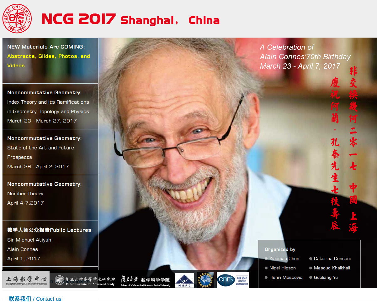 Du 23 mars au 7 avril 2017 : Colloque NCG 2017, à l’occasion des 70 ans d’Alain Connes, à l’Université Fudan de Shanghai