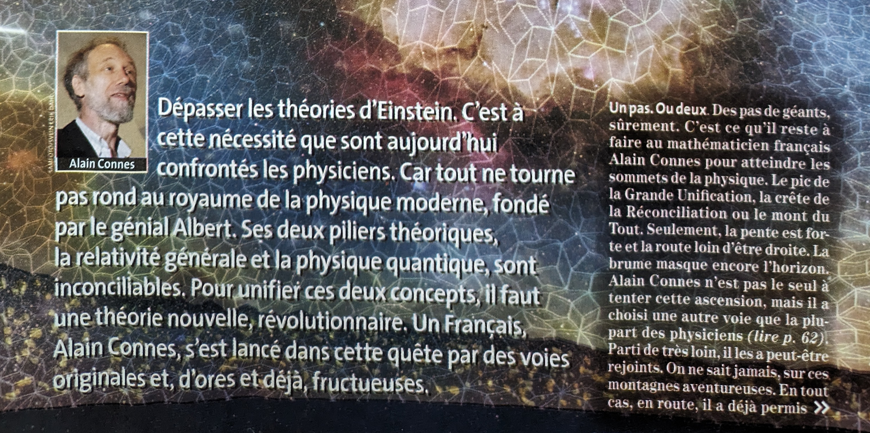 Un article d’un magazine Science et avenir d’octobre 2005 (date à laquelle j’ai commencé mon travail sur CG) et présentant le travail d’Alain Connes en lien avec l’espace-temps