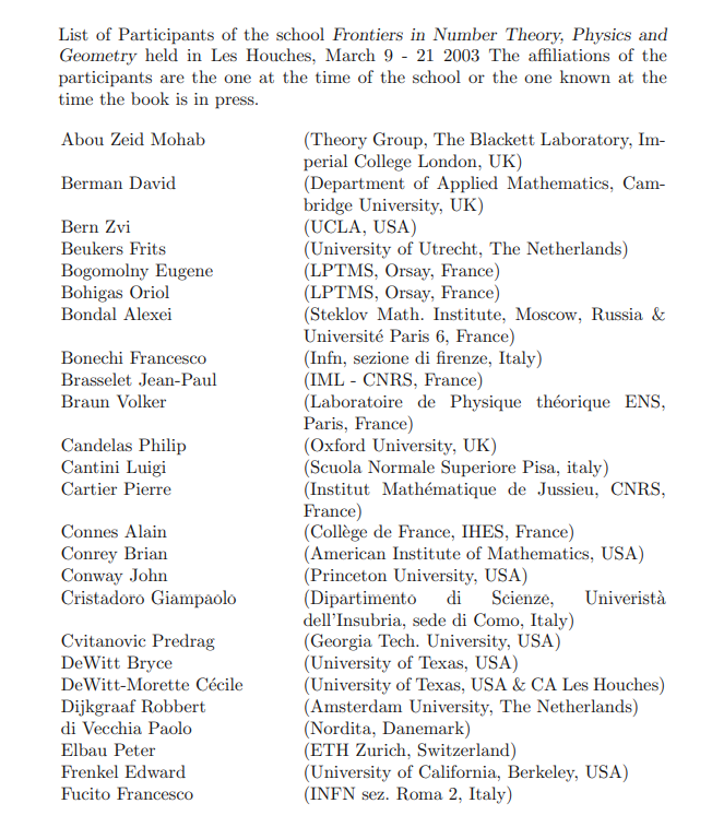 Du 9 au 21 mars 2003, Les Houches, France, École Frontiers in Number Theory, Physics and Geometry, voir liste des participants, livre éponyme.