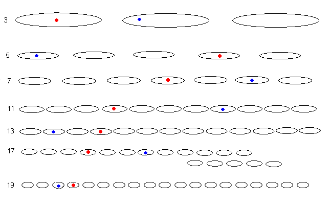 Démontrer la conjecture revient donc à démontrer qu'il ne peut jamais y avoir au moins une case coloriée dans chaque ligne. (remarque : les colonnes des nombres premiers supérieurs à 2x/3 ne peuvent pas contenir de cases coloriées.) Autre façon de voir les choses : prenons l'exemple du nombre pair 40. Ci-dessous sont dessinés les résidus possibles selon chaque nombre premier inférieur à 20 (3 classes de congruence modulo 3, 5 classes de congruence modulo 5, etc). Par convention, on dessine la classe 0 à l'extrême-gauche du dessin. Les points bleus représentent l'appartenance de 40. 3 permet de trouver une décomposition Goldbach de 40 car 3 n'est jamais dans le même ensemble de congruence que 40. Démontrer la conjecture de Goldbach consiste donc à démontrer qu'il existe toujours un nombre premier qui ne partage aucune classe de congruence avec 2x. La table fournie pour le cas 98 est en fait sous-table d'une table de congruence complète, que nous allons fournir ici pour le cas 40, de façon à conserver une certaine lisibilité.