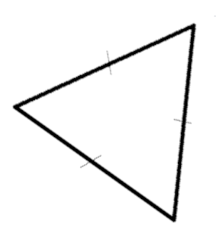 Exemple : ci-dessous un triangle équilatéral. Note les petits traits que l'on a mis sur les 3 côtés pour rappeler qu'ils sont de même longueur.