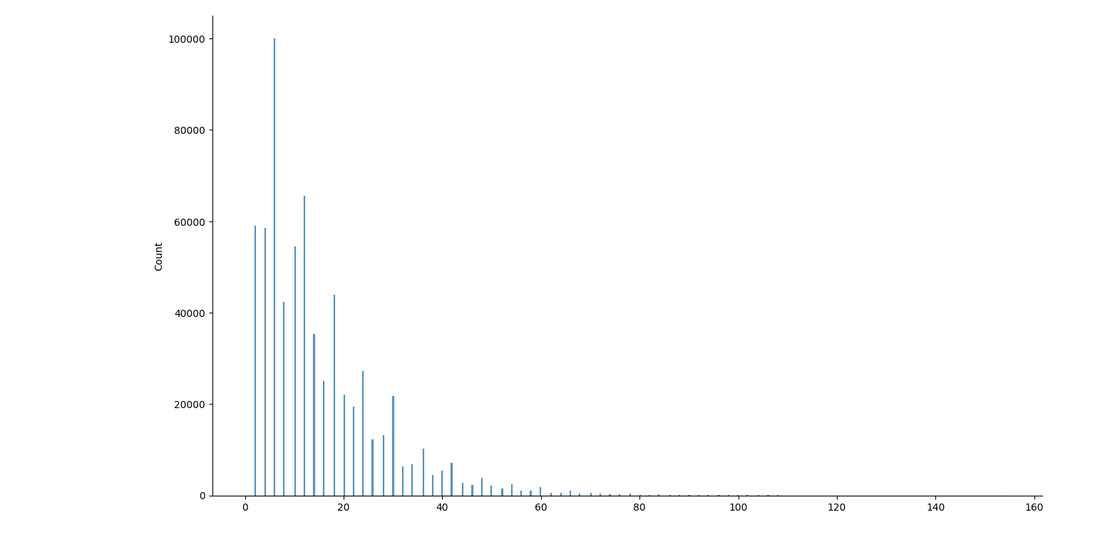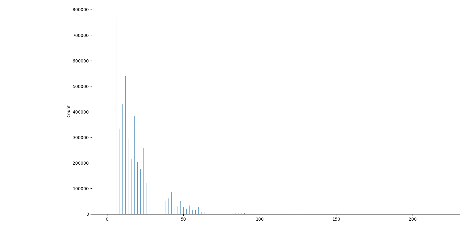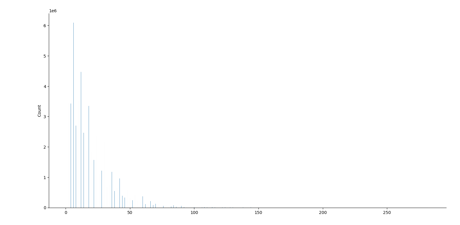 août 2025 : prime gaps : écarts entre deux nombres premiers successifs, histogrammes pour les nombres premiers jusqu’à 106, jusqu’à 107, jusqu’à 108, jusqu’à 109 (des manques dans ce dernier graphique, le package seaborn a du mal)