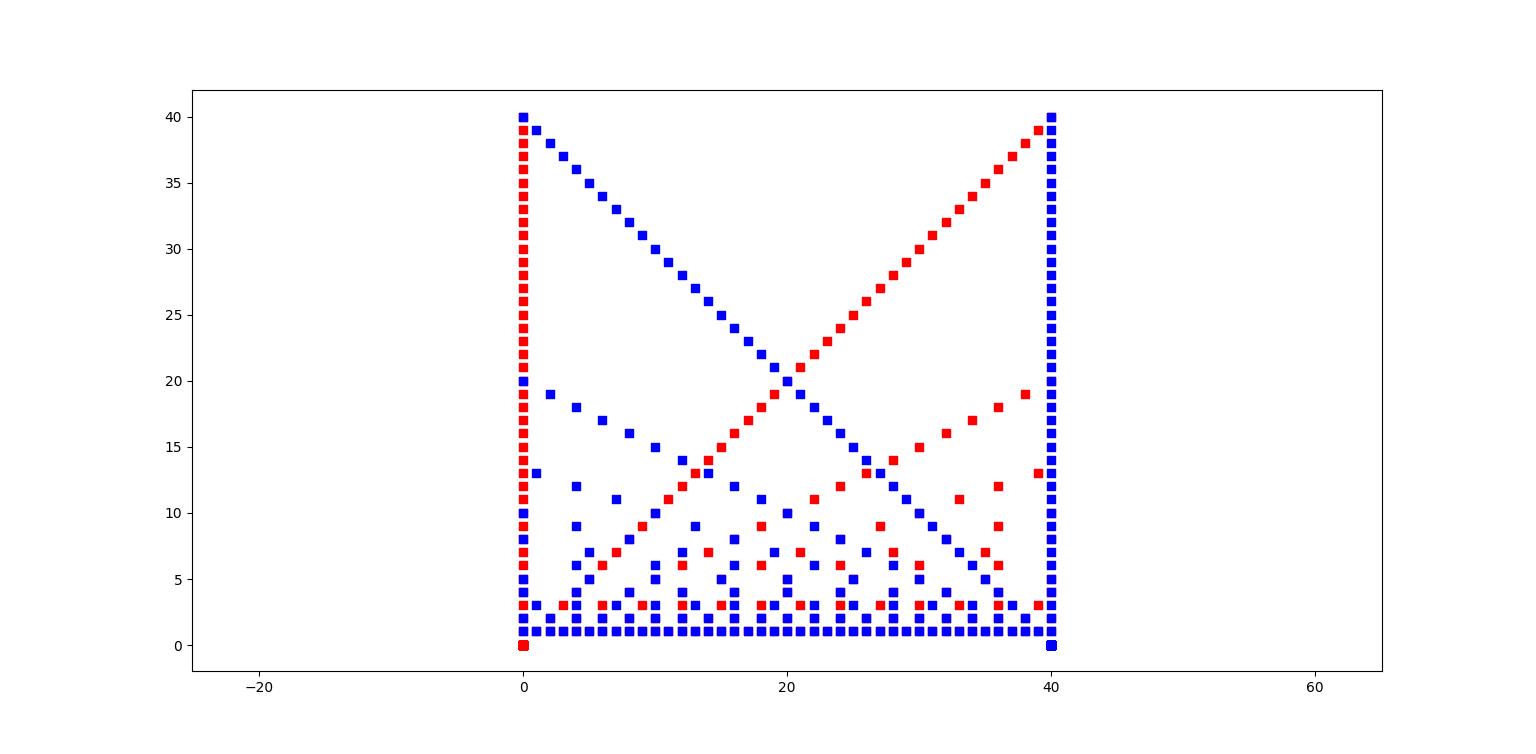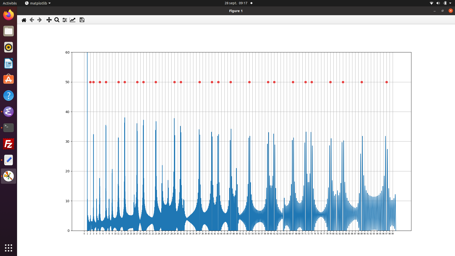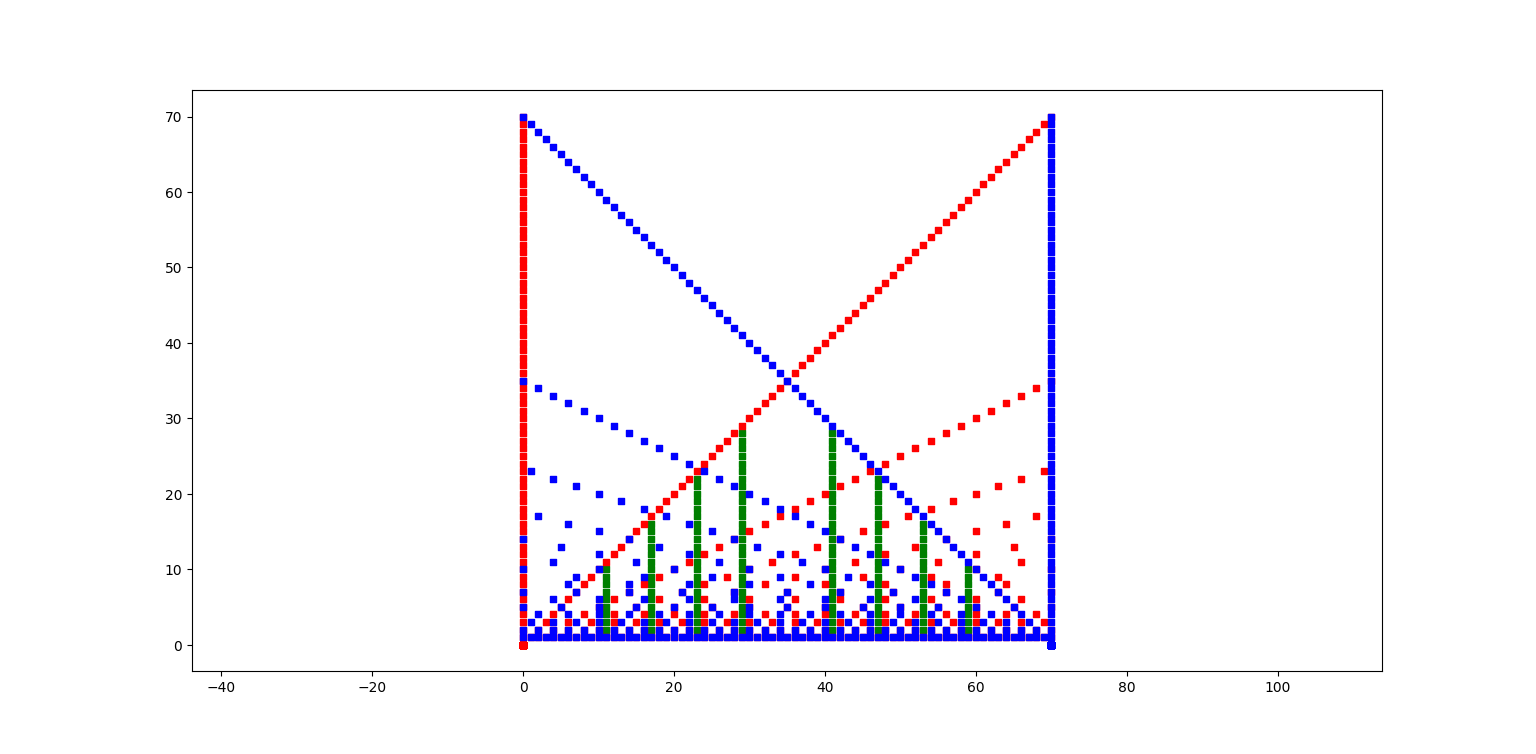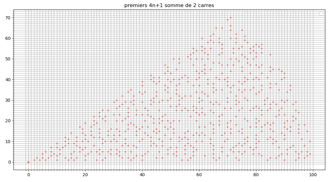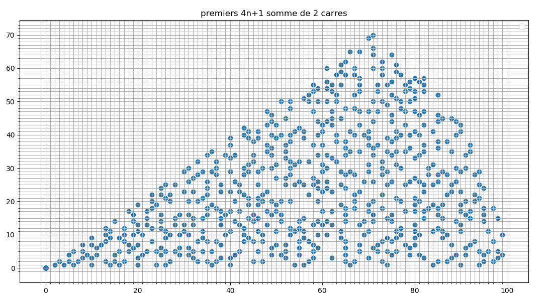 25.02.25 : L’ancien maillage que j’avais mis au jour en 2005 (voir aux pages ici et là) peut s’obtenir en calculant des sommes par utilisation de l’entropie de Shannon, entropie intervenant également en physique, ça fait plaisir ! Voici le programme utilisé pour obtenir les maximum "scatterisés" par python ci-dessous (on voit très bien 26=13+13, 24=11+13=13+11, etc.) :
