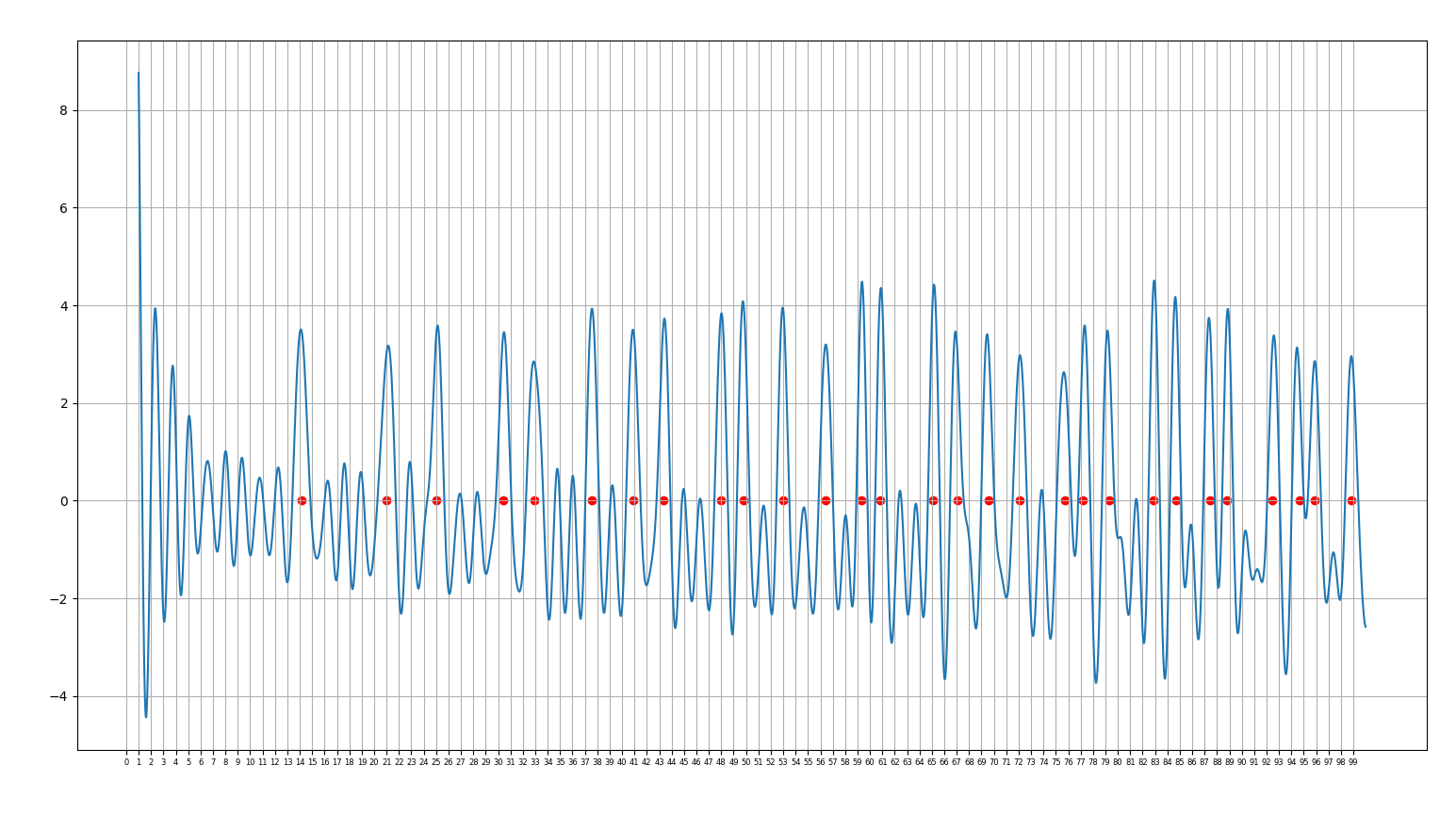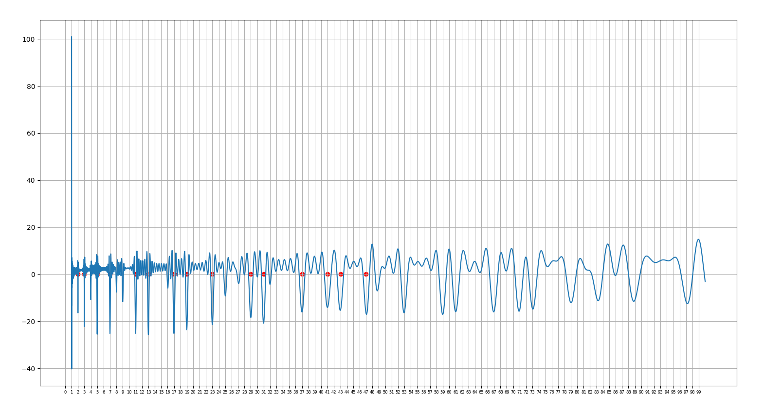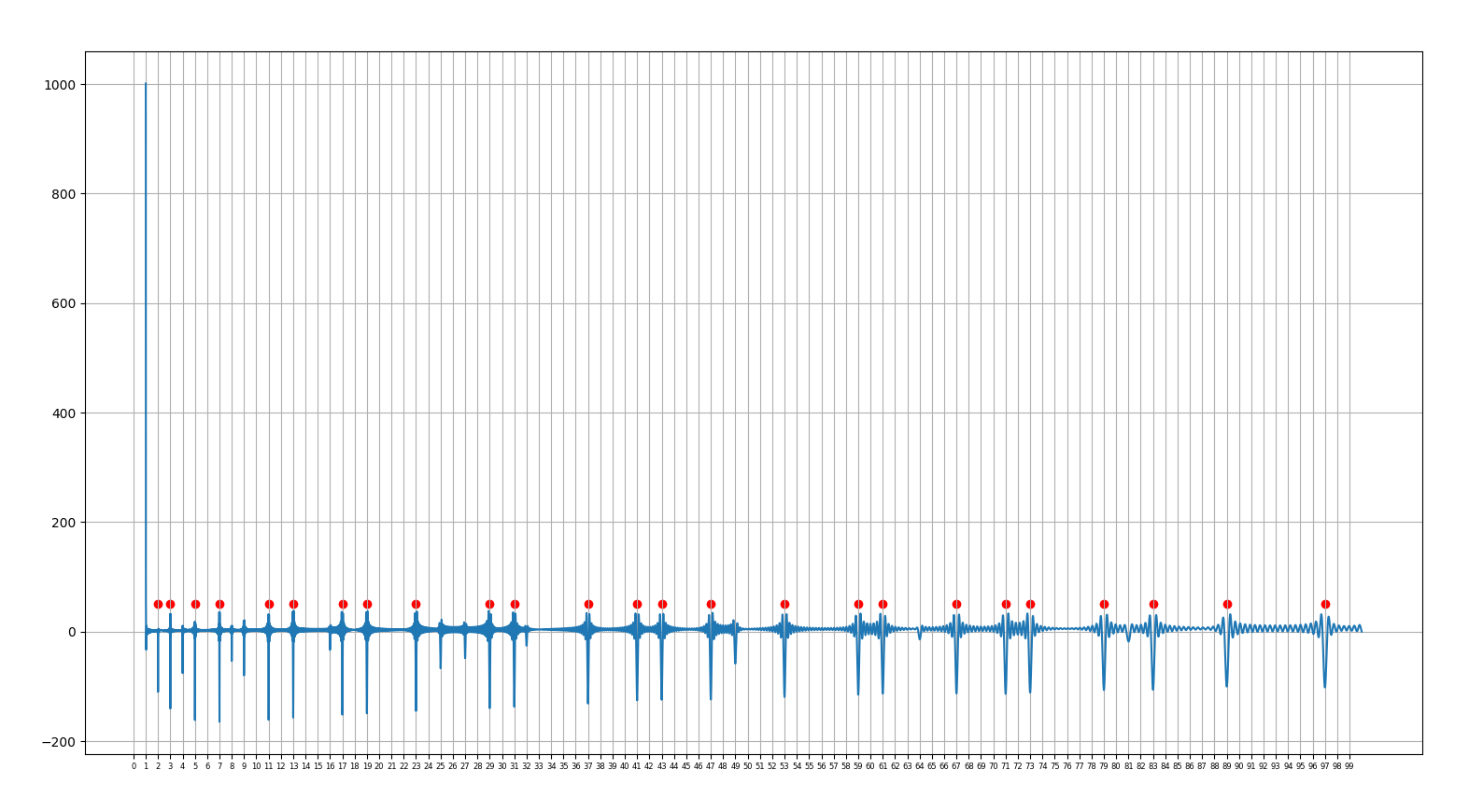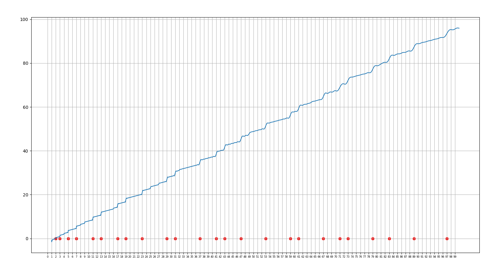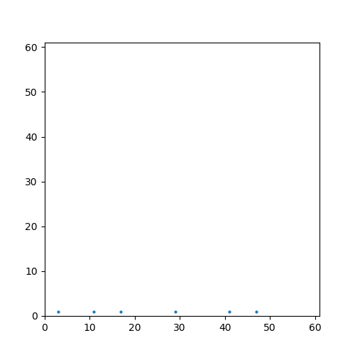 25.02.25 : L’ancien maillage que j’avais mis au jour en 2005 (voir aux pages ici et là) peut s’obtenir en calculant des sommes par utilisation de l’entropie de Shannon, entropie intervenant également en physique, ça fait plaisir ! Voici le programme utilisé pour obtenir les maximum "scatterisés" par python ci-dessous (on voit très bien 26=13+13, 24=11+13=13+11, etc.) :