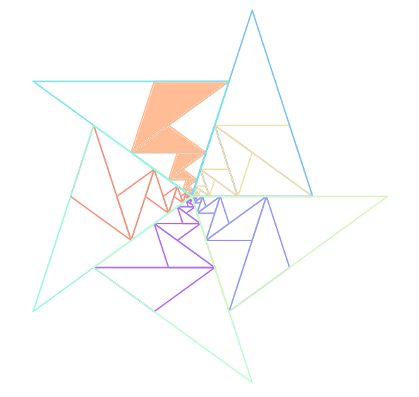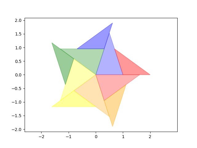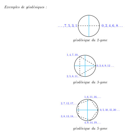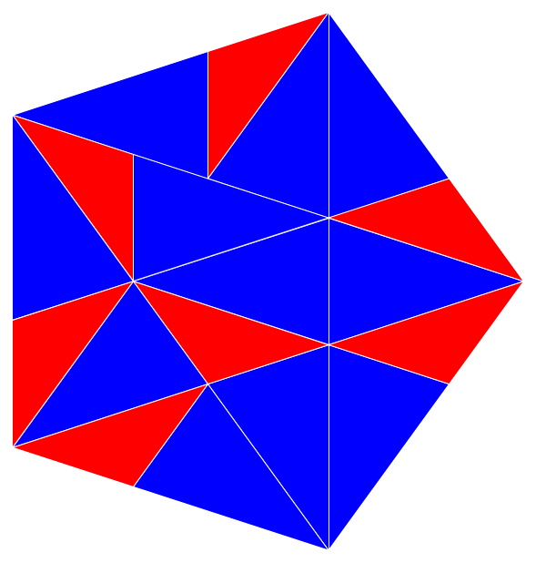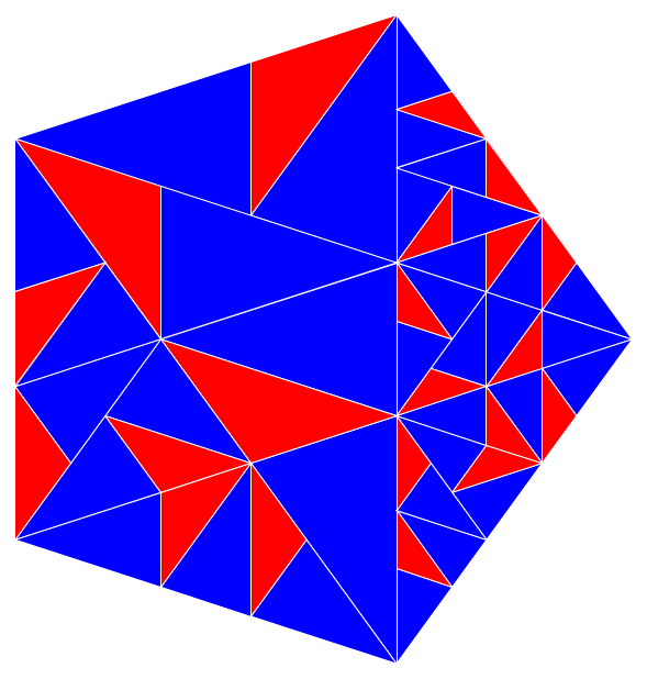 On a essayé de montrer, par la couleur sur l’une des images, une sorte de bande de papier triangulaire infinie d’angle 36° et qu&rsuqo;on plierait sur elle-même en alternant le sens une fois sur deux ...