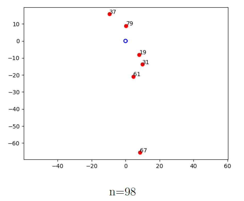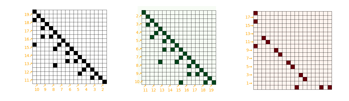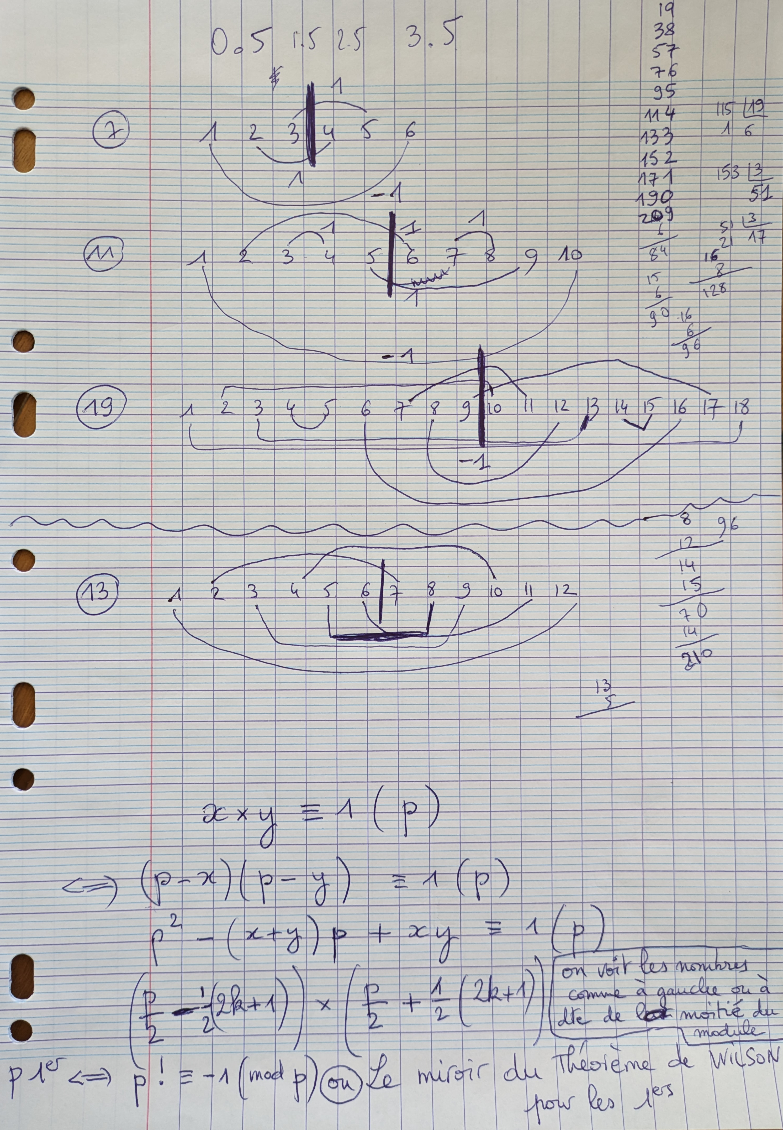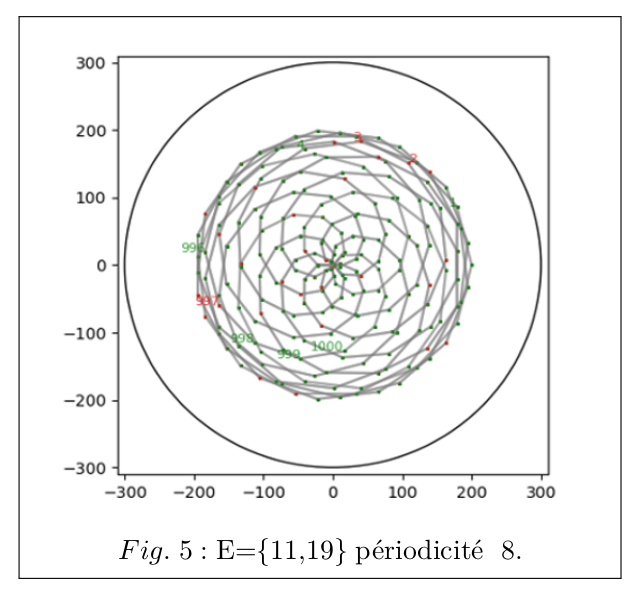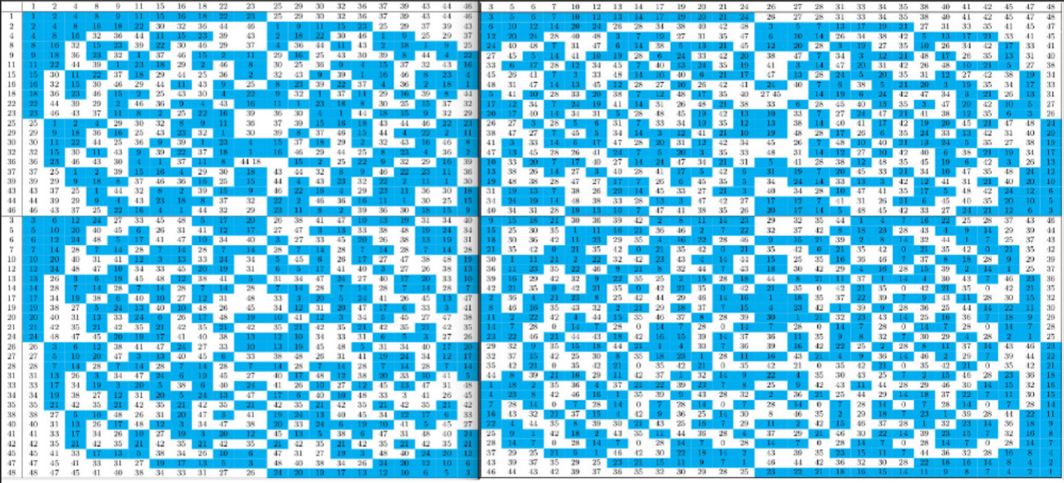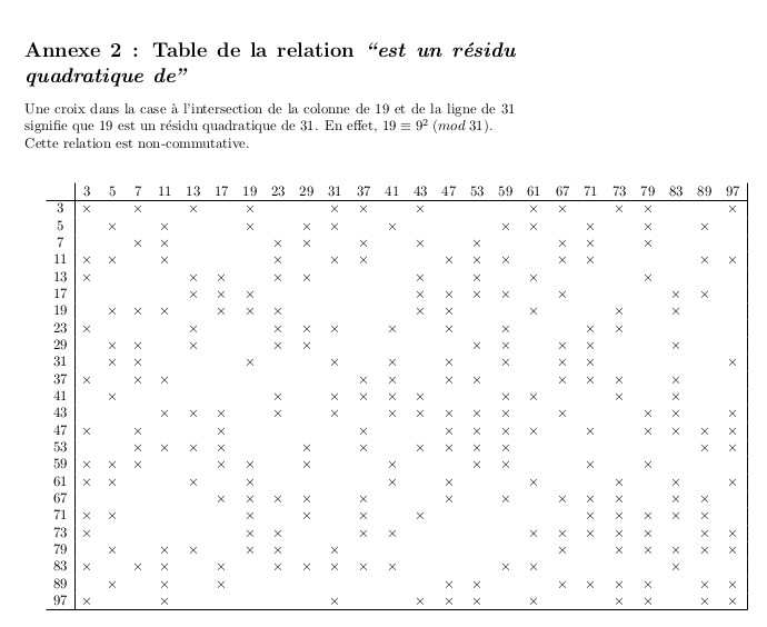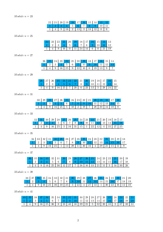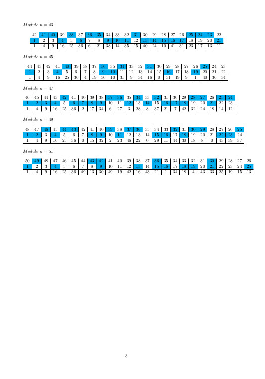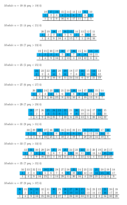 avec la relation non résidu quadratique de annotée, parce que ces dessins font penser à la démonstration géométrique d’Eisenstein de la loi de réciprocité quadratique (voir ) résultat d’exécution sans RQ  tables de multiplication dans ℤ/nℤ