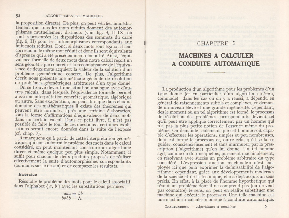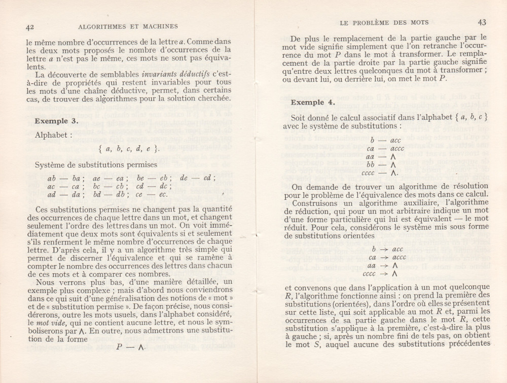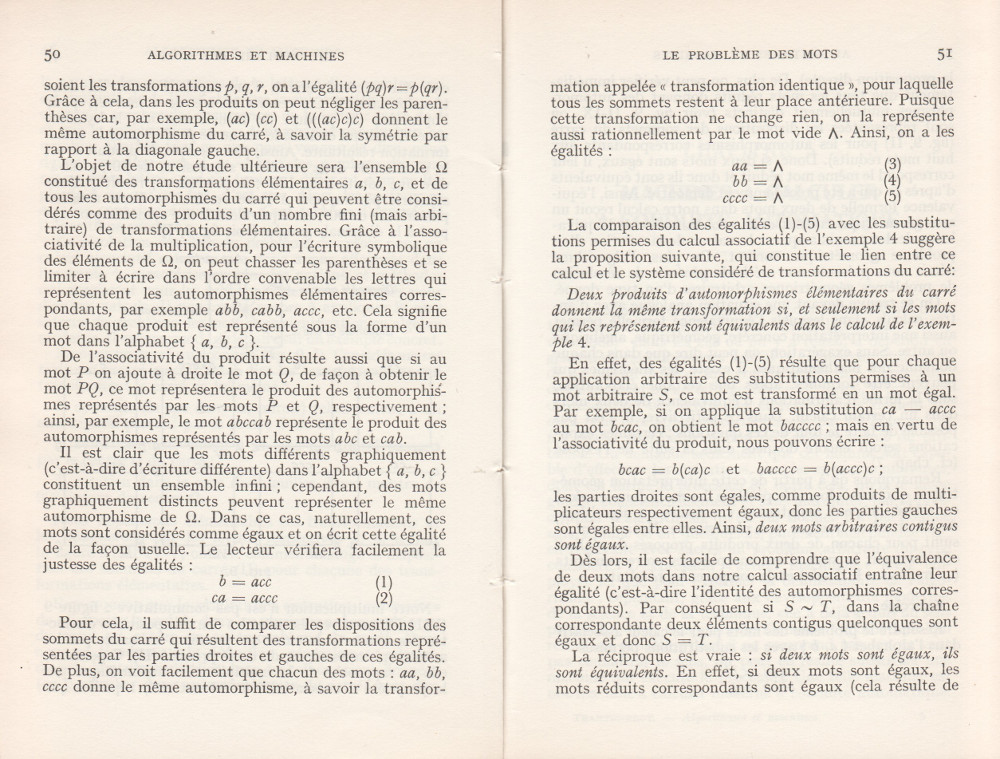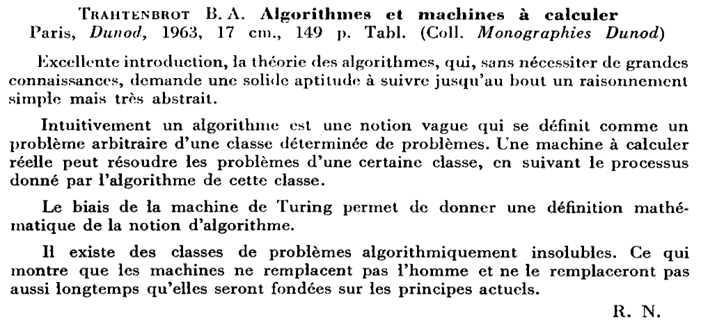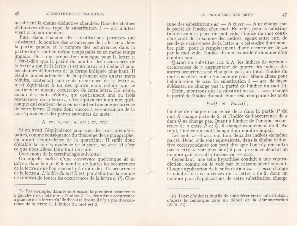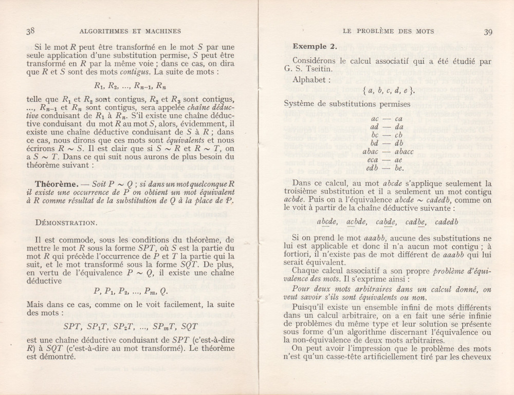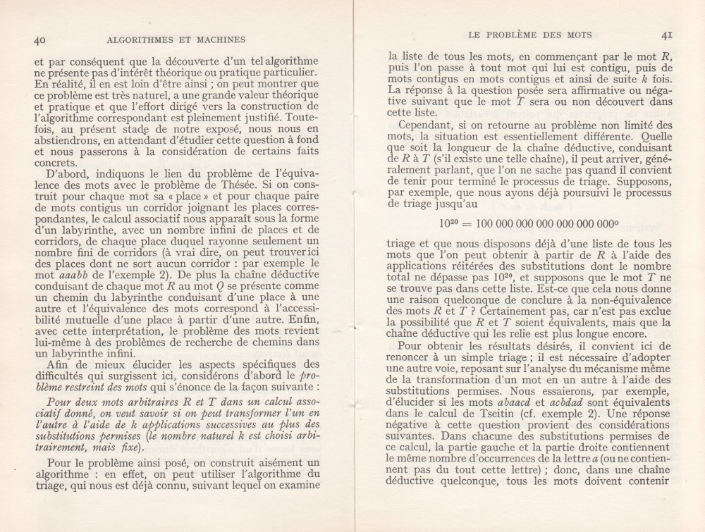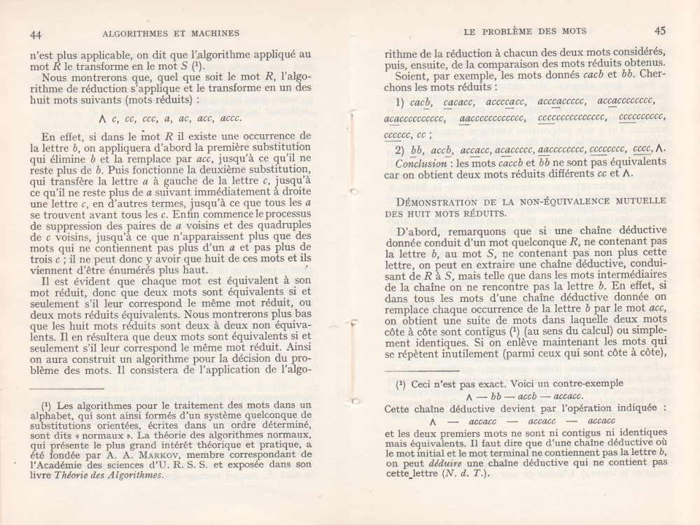 (André Lentin est un mathématicien, logicien et informaticien théoricien français né le 9 novembre 1913 à Médéa en Algérie et mort le 9 janvier 2015 dans le 15e arrondissement de Paris. Son article est à mettre en lien avec le petit livre de Trahtenbrot (Algorithmes et machines à calculer) que m’avait offert Yves Césari, mon professeur d’Algorithmique, alors que j’étais en seconde année de Deug Mathématiques appliquées et Sciences sociales, à l’Université Paul Valéry de Montpellier, et dont on trouvera les scans du chapitre Le problème des mots dans la page de Notes.)