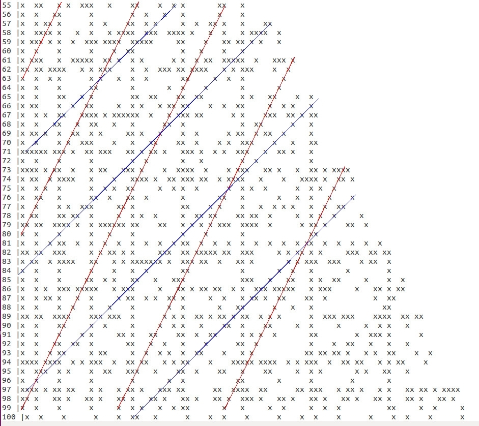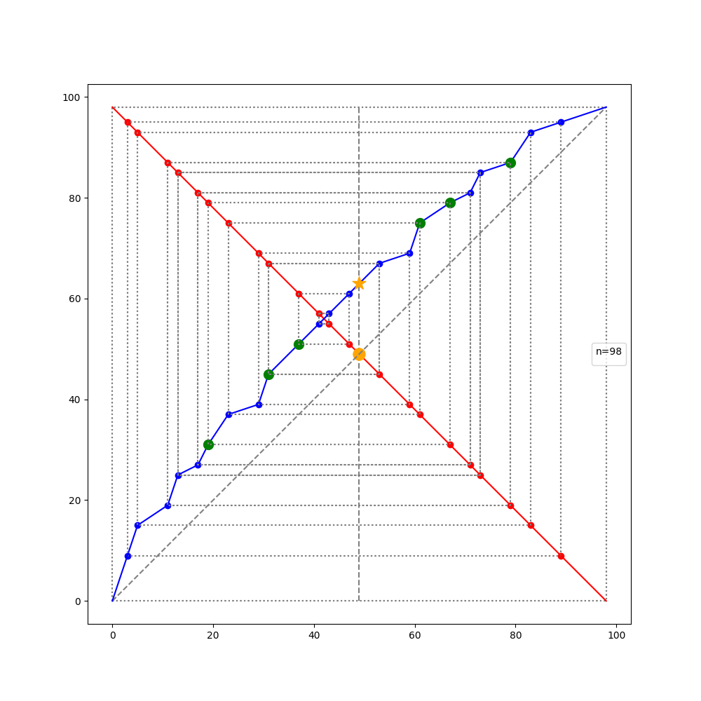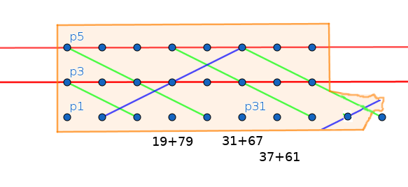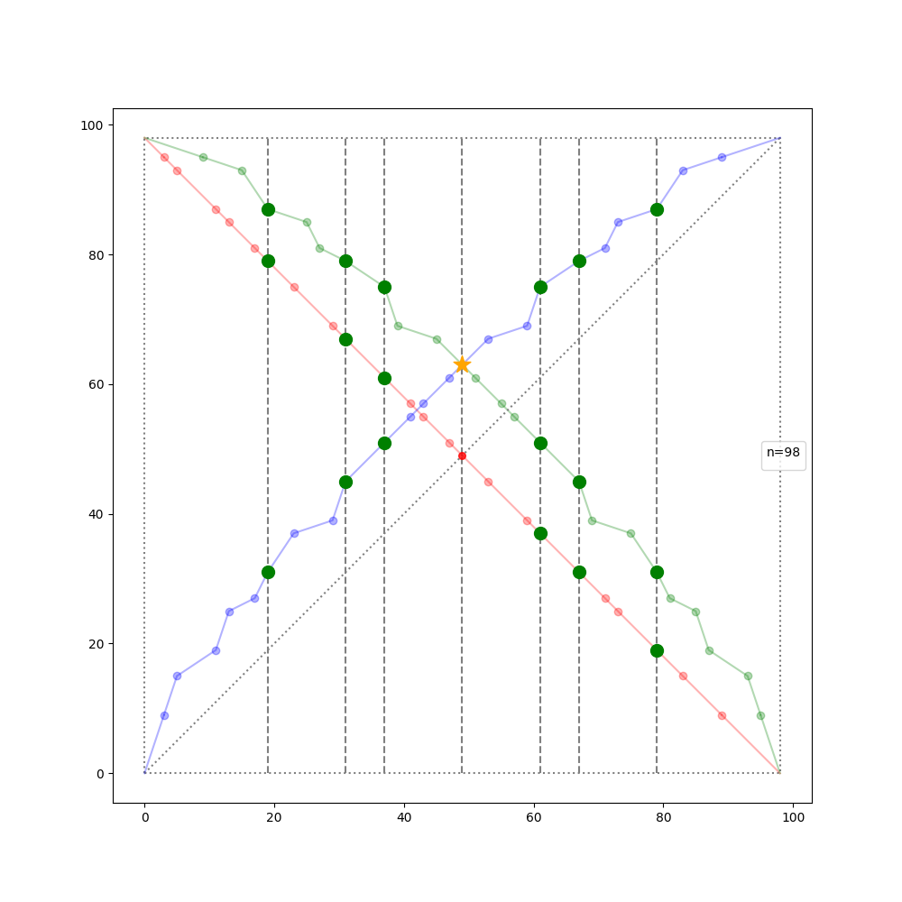 conclusion : ça ne va pas, il y a plein de nombres pairs dont aucun point ne se projette sur la diagonale, mauvaise idée.
