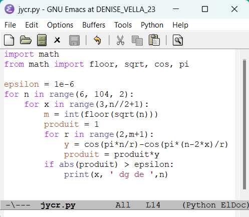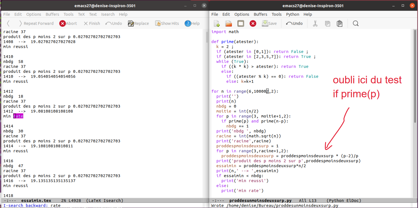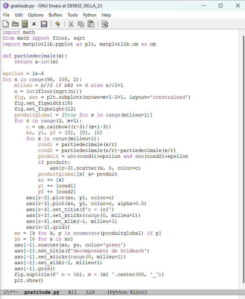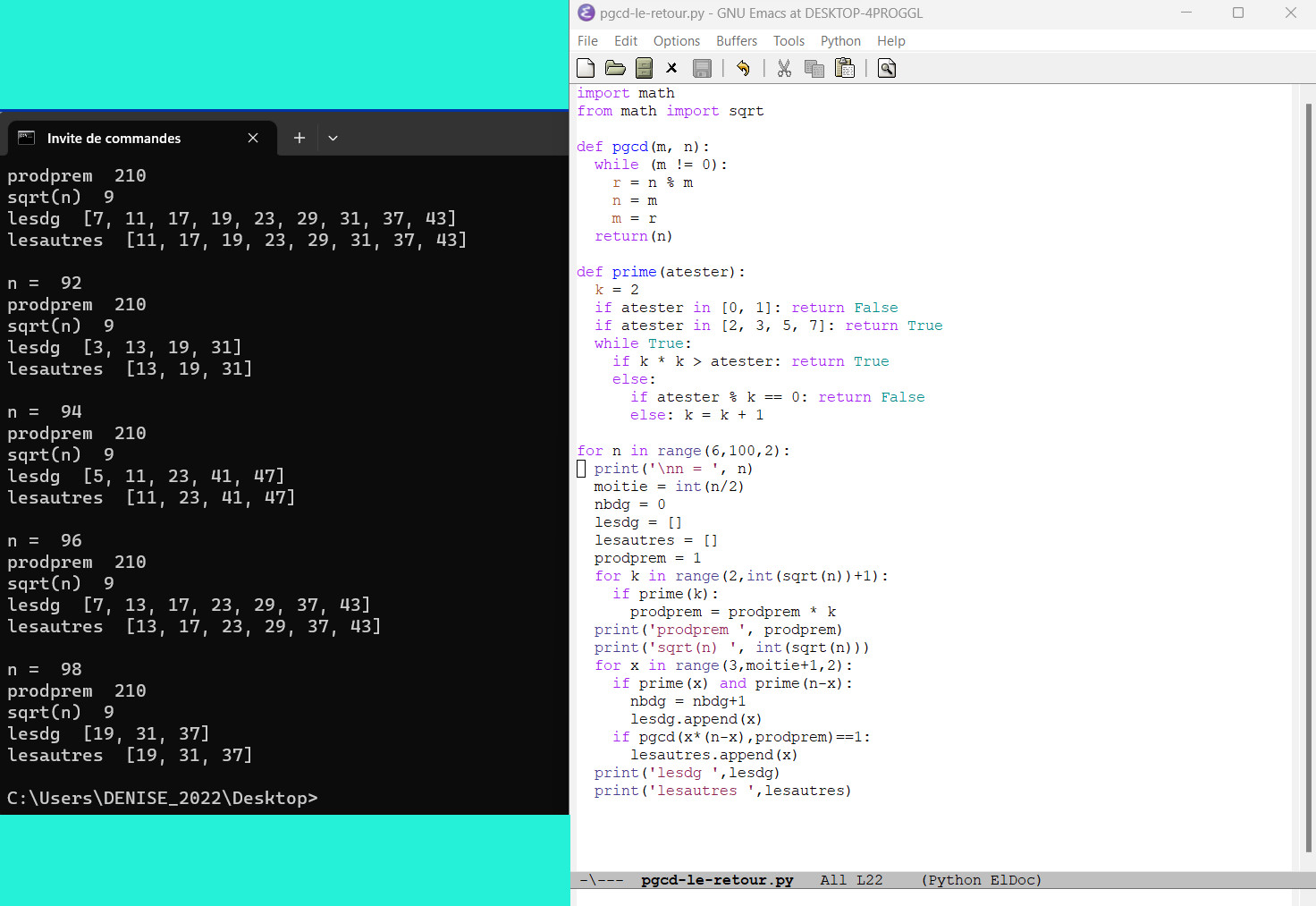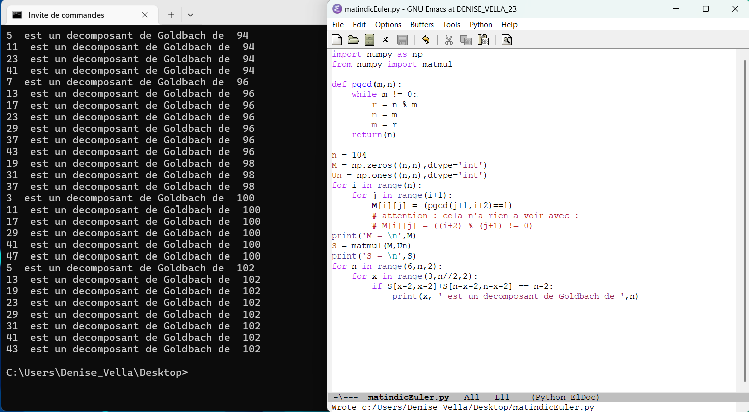 Programmation de la méthode de recherche des décomposants de Goldbach utilisant des mots binaires (un décomposant de Goldbach d’un entier lui permet de vérifier la conjecture de Goldbach) (58)