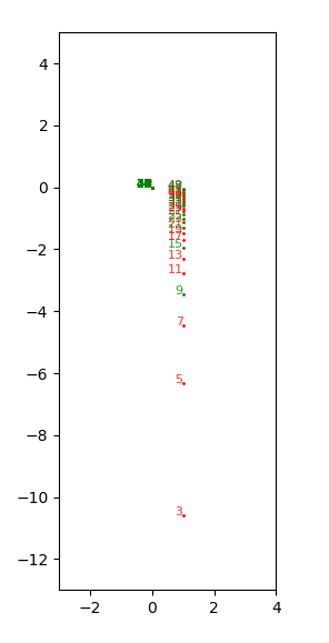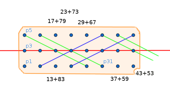Pour trouver les décomposants de Goldbach de n (supérieurs à √ n), il faut faire glisser (= translation = décalage = shift) les transparents l’un par rapport à l’autre de n (le transparent des pixels bleus dit "p est premier" (si à son abscisse est positionnée une colonne de pixels blancs, dans le premier quadrant, strictement entre la ligne de 1 et la diagonale x=y), le transparent des pixels rouges dit "le complémentaire n-p de p est premier".
