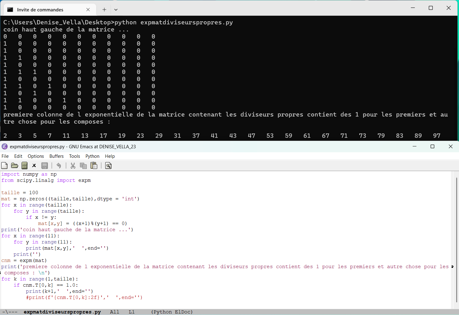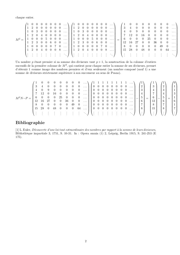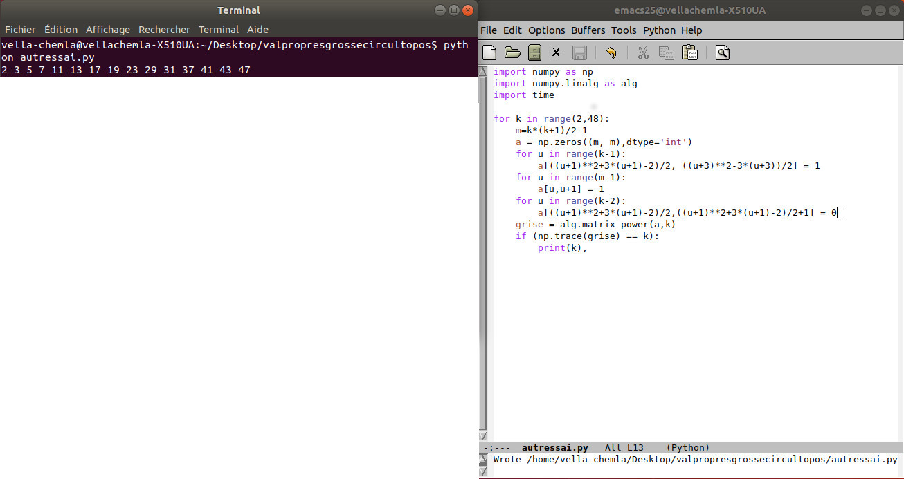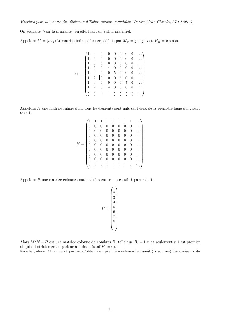 mai 2025 : la première colonne de l’exponentielle d’une matrice de booléens détectant les seuls diviseurs propres fournit la primalité