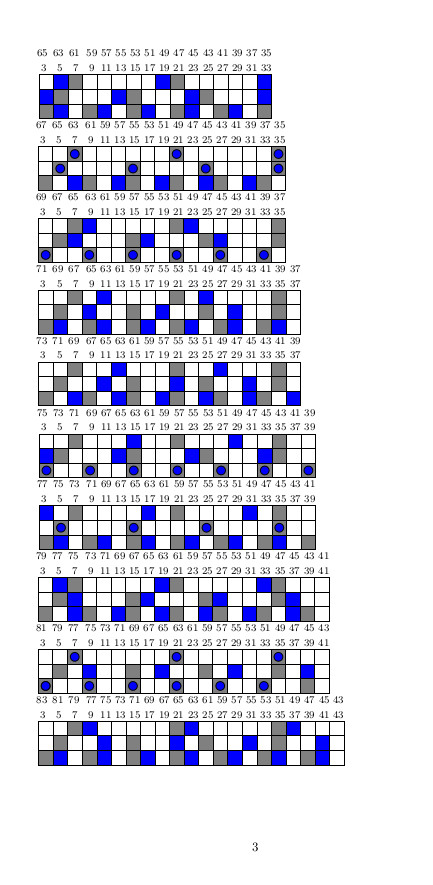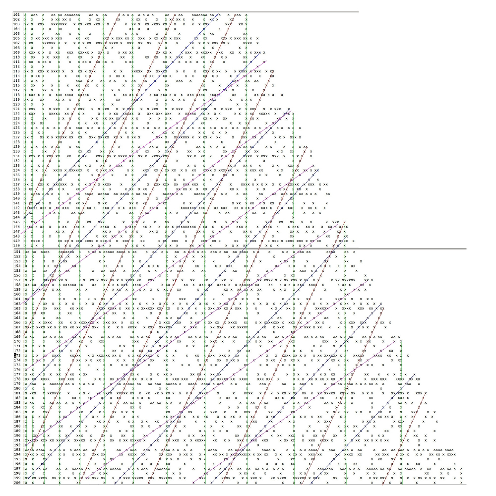 La bicouche de Goldbach est constituée de deux couches superposées de spins : sur la couche du bas (bleue), on voit ligne par ligne les divisibilités par 2, 3, 4, notées par des pixels bleus, parmi des pixels blancs. La couche du haut (rouge) est identique à la couche du bas. On imprime ces deux couches sur de bons vieux transparents pour rétroprojecteur (ou sur des calques TheGimp).