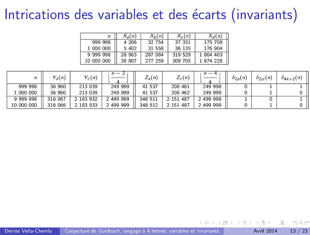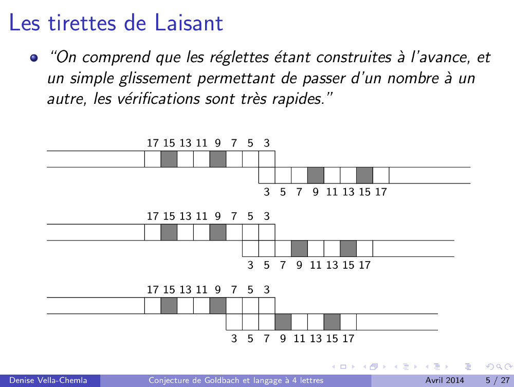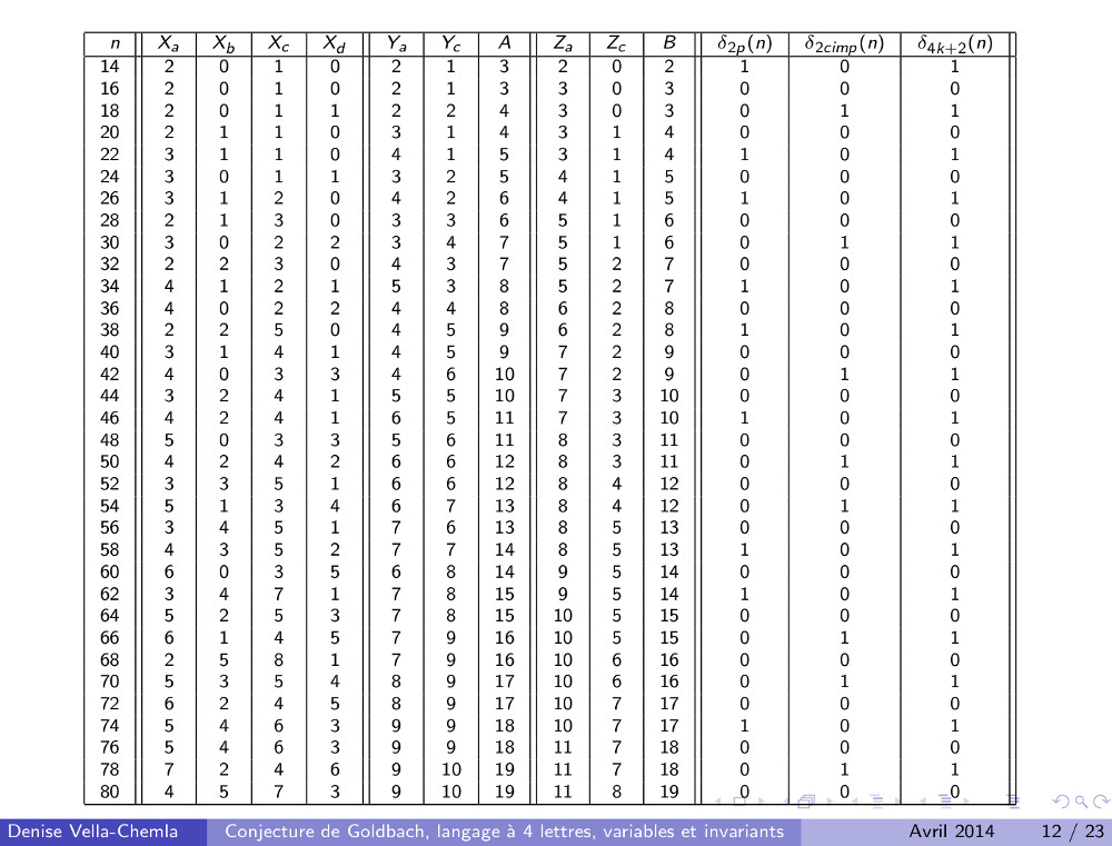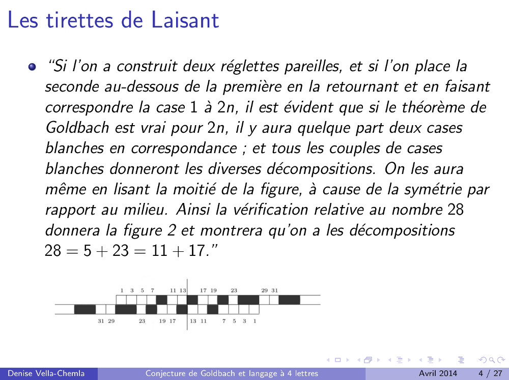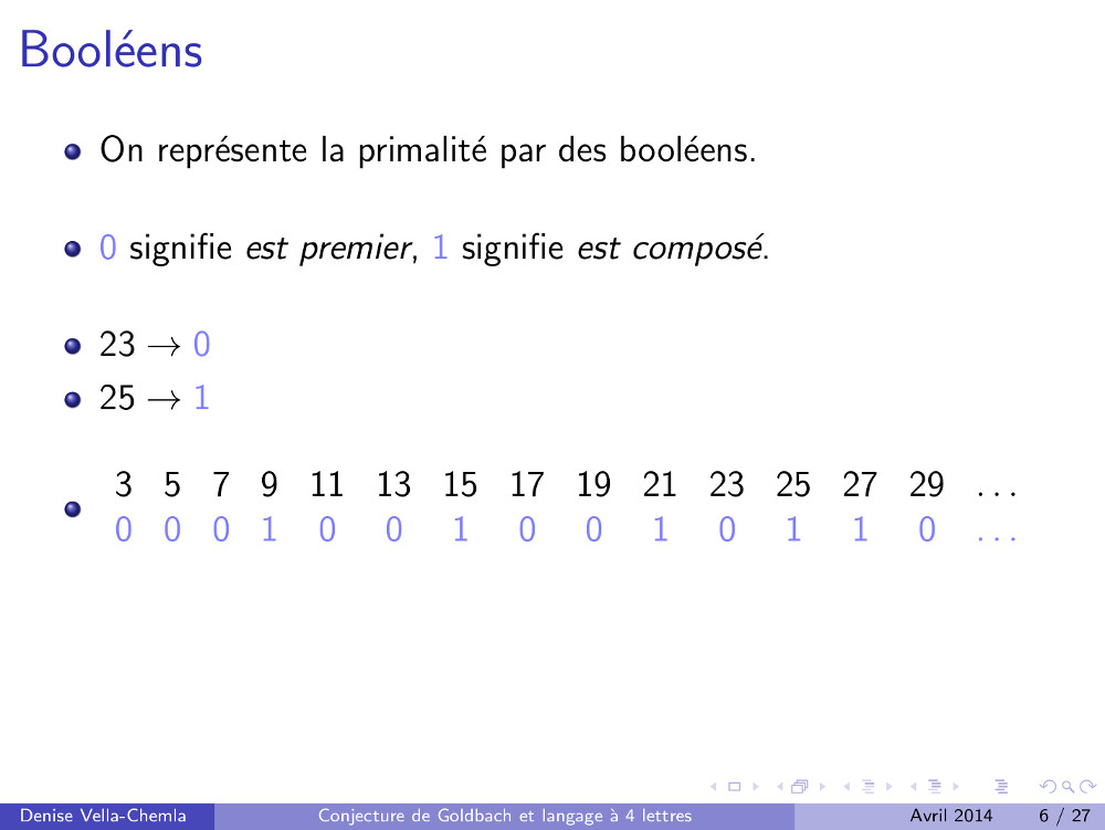 Diapositives (3.05.2009) : Algorithme de calcul des décomposants de Goldbach utilisant des mots binaires (77)