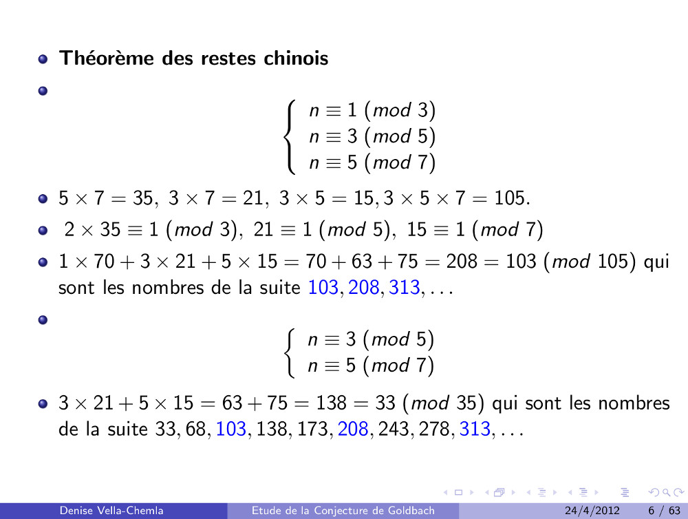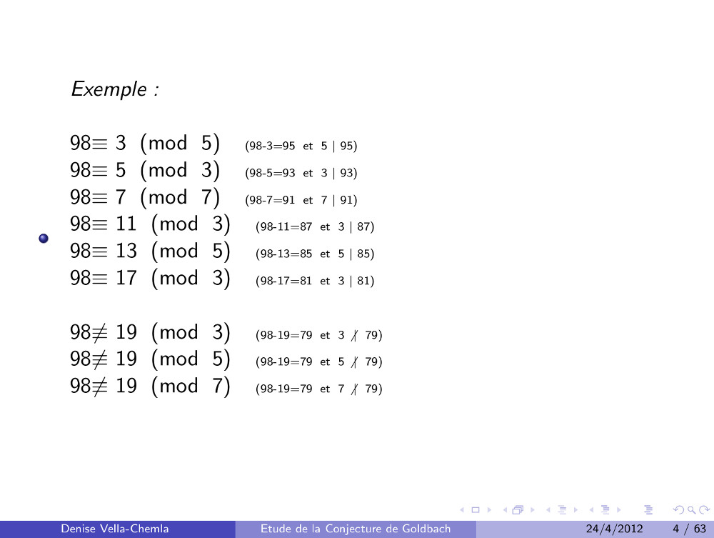 Diapositives (21.03.2009) : Etude de la conjecture de Goldbach utilisant les restes modulaires (63)