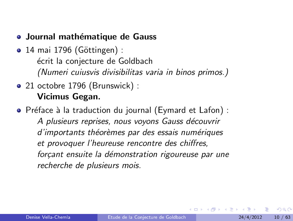10.05.2009 : Valeurs absolues des résidus minima absolus de Gauss et conjecture de Goldbach (81)