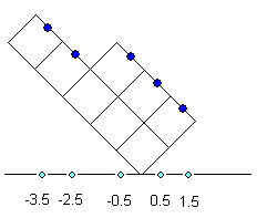 Dans la lettre de Goldbach à Euler, il y a les égalités suivantes : 4 = 1+1+1+1 = 1+1+2 = 1+3 5 = 2+3 = 1+1+3 = 1+1+1+2 = 1+1+1+1+1 6 = 1+5 = 1+2+3 = 1+1+1+3 = 1+1+1+1+2 = 1+1+1+1+1+1 1 est considéré par Goldbach comme un nombre premier (ce qui n’est pas le cas habituellement) et il explique là que pour tout nombre, on peut trouver une décomposition en le nombre de nombres premiers qu’on souhaite de la manière expliquée. Okounkov représente les partitions d’entiers par leur diagramme de Young, qu’il "fait tourner" de 135° par rapport à la façon dont on les note habituellement, les dessinant ainsi "sur la pointe". A chaque partition est associé une sorte de phénotype, qui est l’ensemble des points que certains points du diagramme projettent sur l’axe des abscisses. En ce qui concerne la conjecture, on ne s’intéresse qu’à des partitions en deux nombres seulement et qui en plus sont premiers. Puisque l’article explique qu’il y a autant de partitions possibles pour un entier donné que de représentations irréductibles du groupe symétrique d’ordre cet entier, prouver la conjecture consisterait à prouver qu’un groupe symétrique S(2x) a forcément une représentation irréductible qui se termine par 3/2, qui est de longueur p1 première et qui contient un nombre premier p2 de nombres supérieurs ou égaux à -1/2. Pour ma part, je préfère tout décaler d’1/2 à droite, ça me semble plus lisible, mais il doit sûrement y avoir une raison pour qu’Okounkov "accroche les pointes à 0" ! Ci-dessous, la représentation "à la Okounkov" de la partition 3+5 de 8.