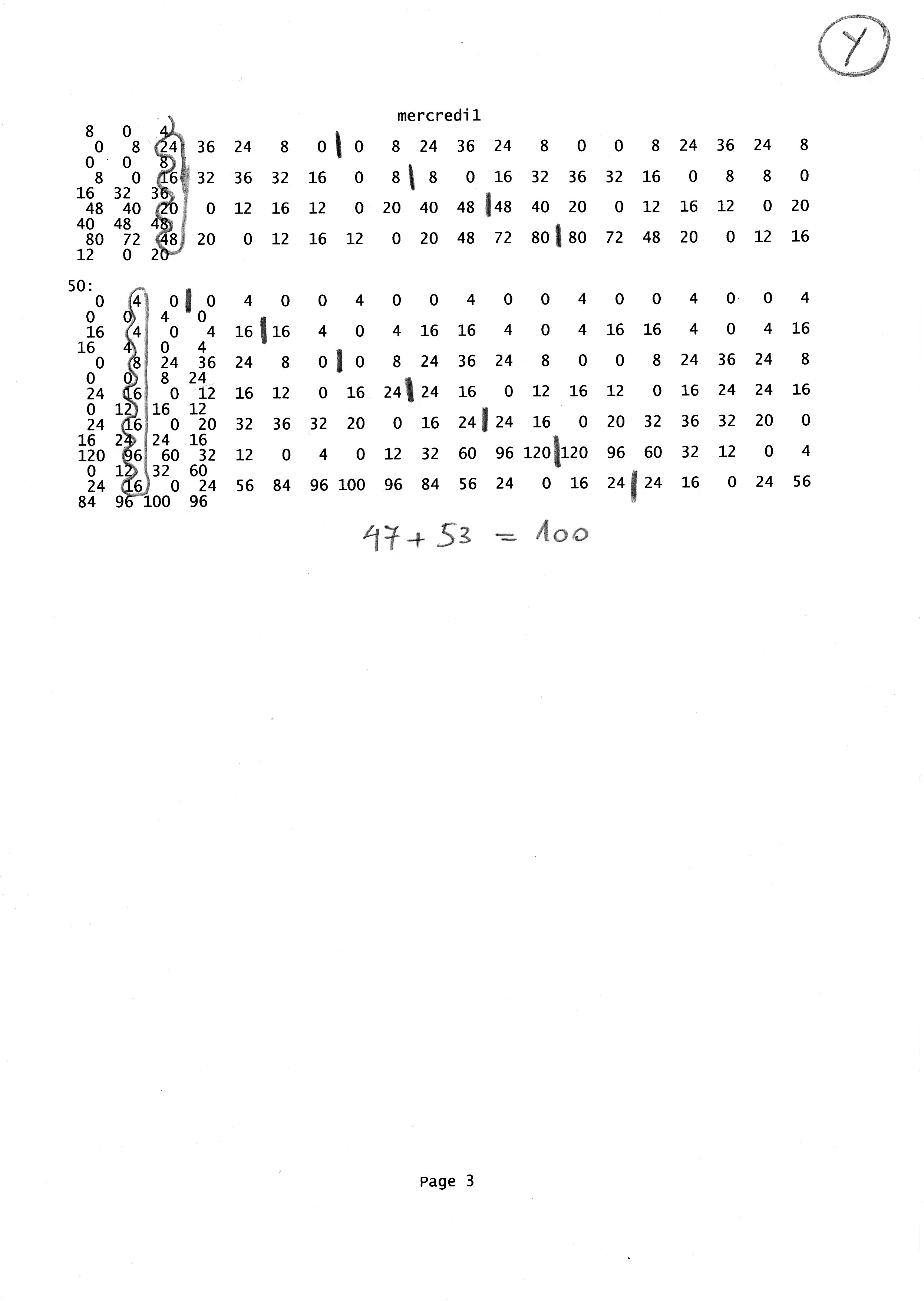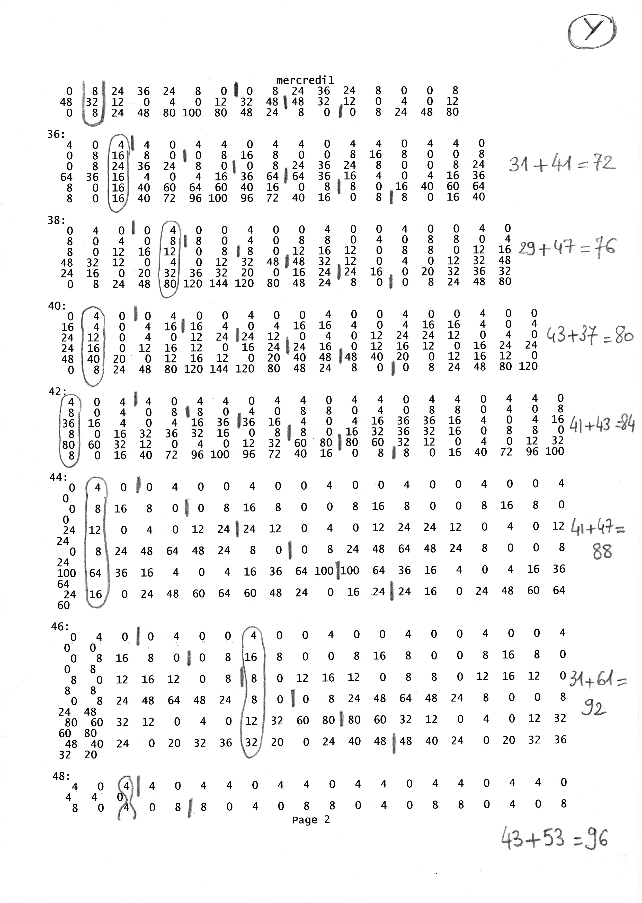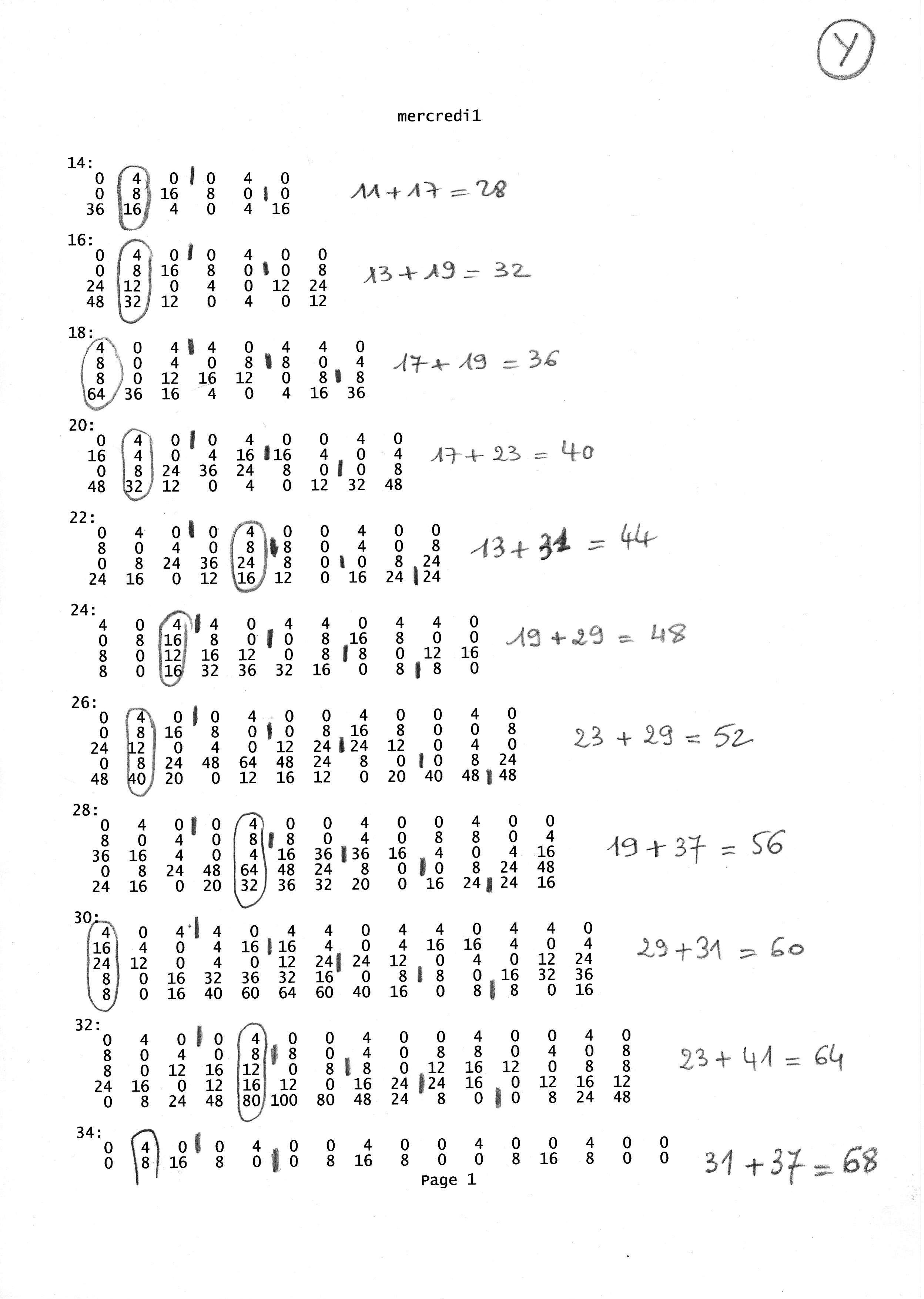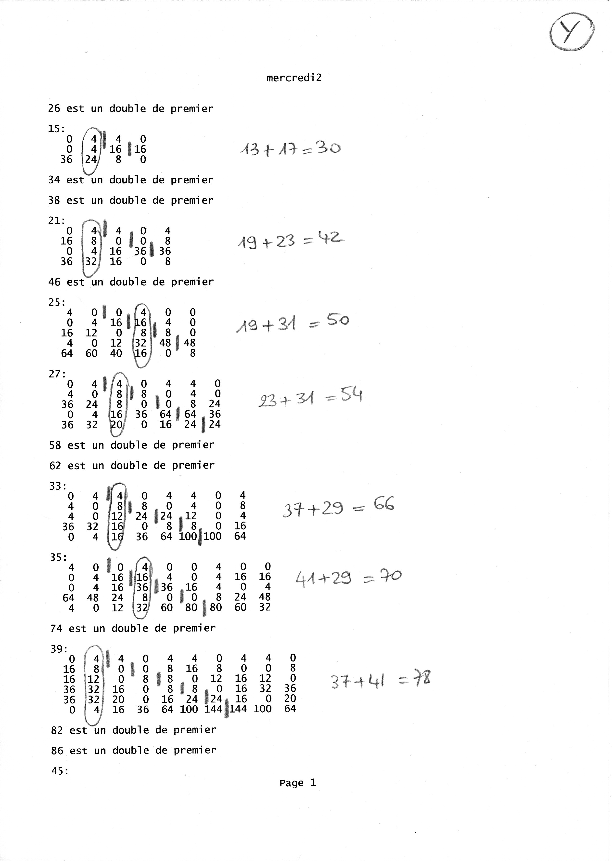J'ai programmé aujourd'hui ce que j'ai expliqué dans la note "Tester autrement la primalité" qui consiste à trouver les nombres premiers en calculant des produits de valeurs absolues de résidus modulaires minima de Gauss. J'ai compris pourquoi mes courbes en dents de scie permettent toujours de trouver une colonne de zéros : c'est parce que les dents de scie ne sont jamais "en phase", elles sont toujours décalées les unes par rapport aux autres, soit d'un cran pour les doubles d'impairs, soit de deux crans pour les doubles de pairs. J'espère que quelqu'un va m'aider à écrire tout cela proprement. On peut trouver ici les scans du résultat des deux programmes, l'un traitant les doubles de nombres pairs, l'autre traitant les doubles de nombres impairs, que j'ai annotés d'un petit trait d'une part pour visualiser les centres de symétrie des courbes en dents de scie, et d'autre part, dans lesquels j'ai entouré la colonne fournissant la décomposition de Goldbach centrale (celle qui minimise la différence entre les deux décomposants). première page des doubles de pairs compris entre 28 et 68 deuxième page des doubles de pairs compris entre 68 et 96 première page des doubles de pairs compris entre 96 et 100 première page des doubles d'impairs compris entre 26 et 86 première page des doubles d'impairs compris entre 90 et 98 |