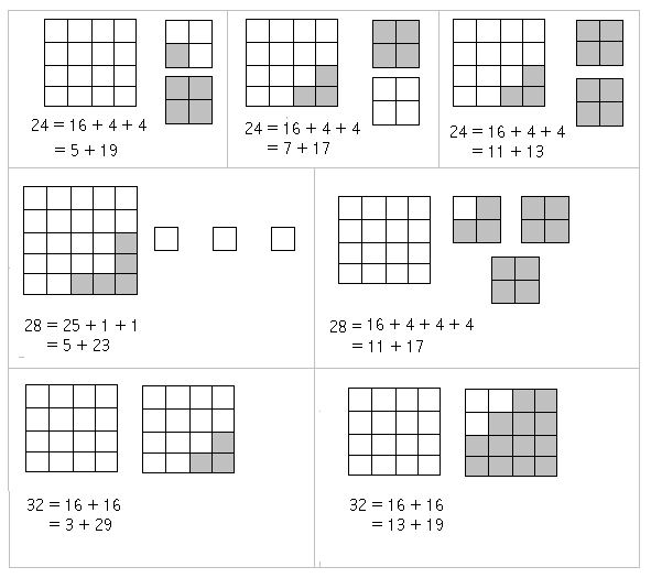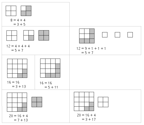 Quant aux nombres premiers de la forme 4n+1, ils sont d'une unique façon somme de deux carrés. Un temps, j'ai essayé d'avancer dans cette voie des décompositions en carrés : les nombres pairs sont soit des 4n, soit des 4n+2. Les 4n+2 sont soit sommes de 2 nombres premiers 4n+1, soit de deux nombres premiers 4n+3. Les 4n quant à eux sont sommes d'un nombre premier 4n+1 et d'un nombre premier 4n+3. Ci-dessous sont dessinés les premiers cas...